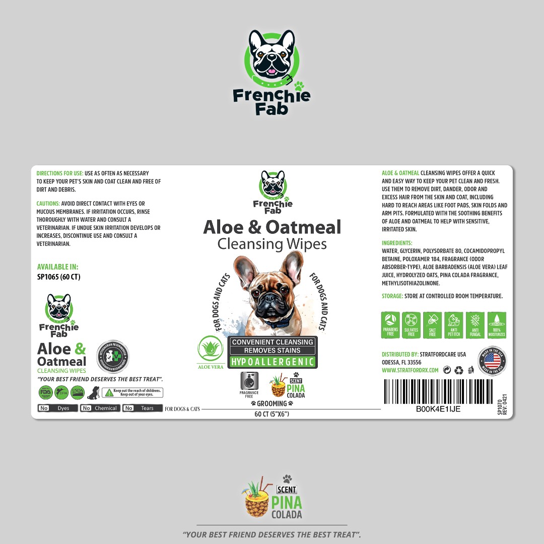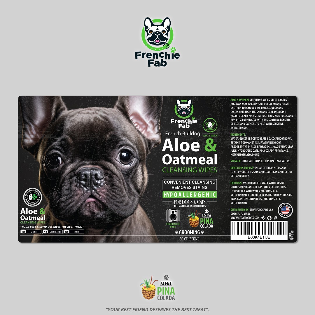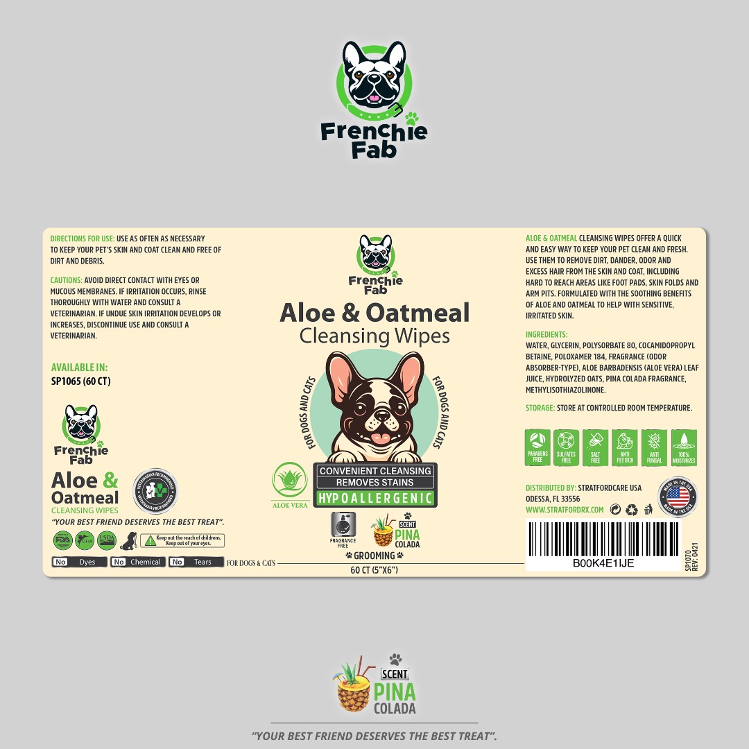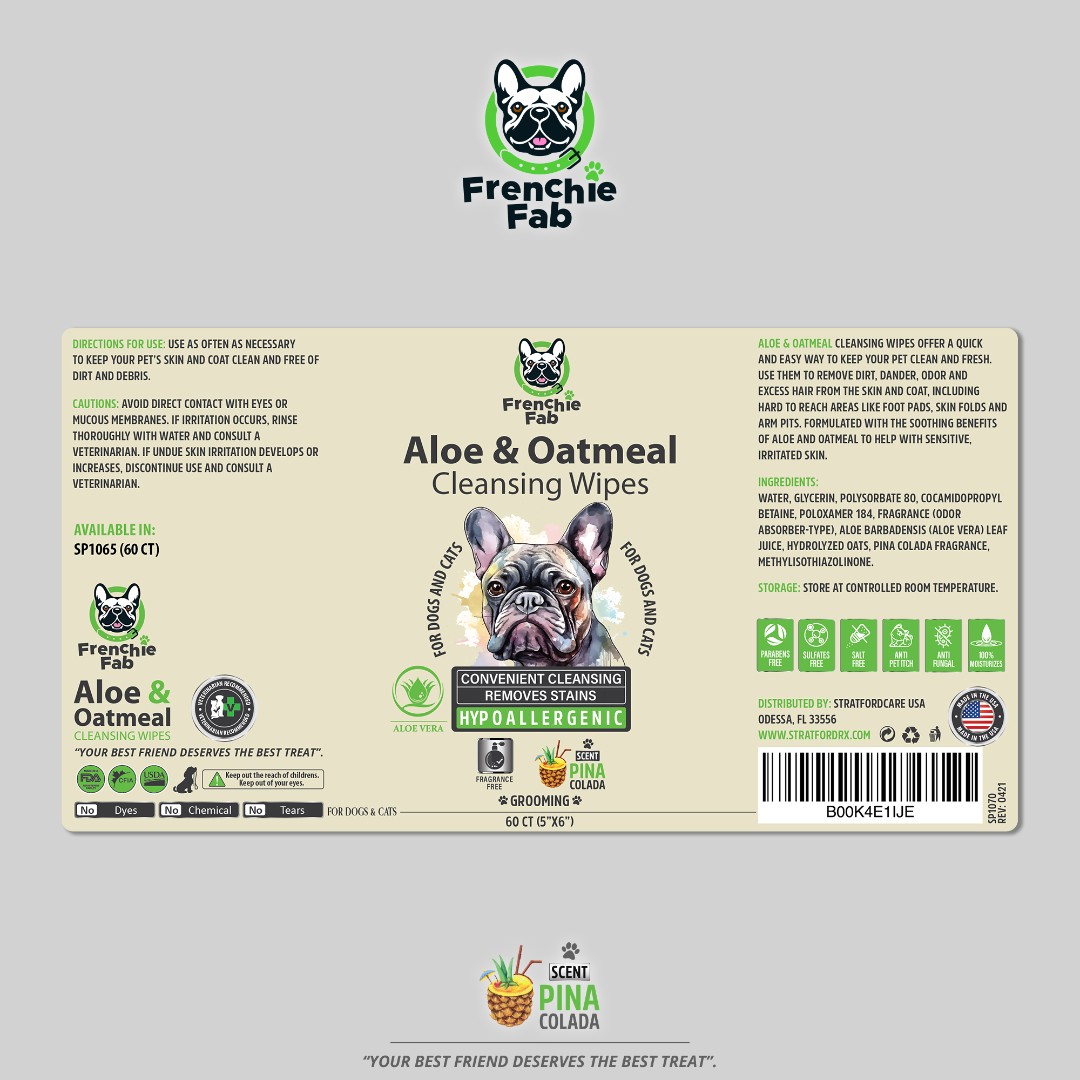 Frenchie Fab needed to create a visually appealing and informative label for their Aloe & Oatmeal Cleansing Wipes that communicates safety, natural ingredients, and suitability for both dogs and cats.