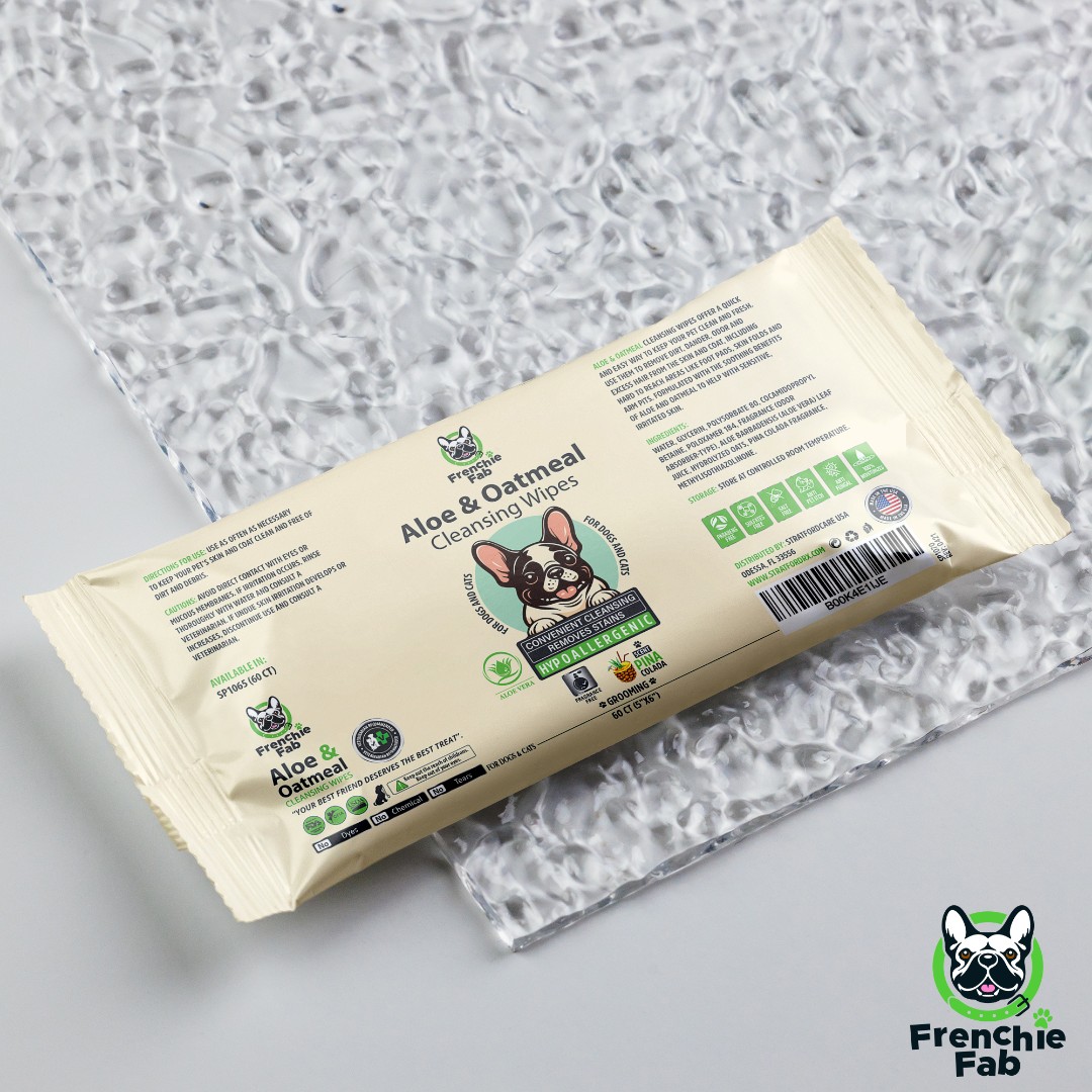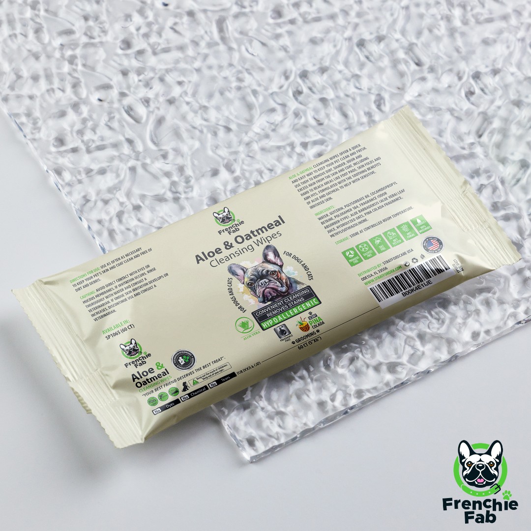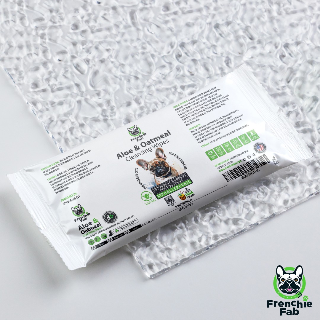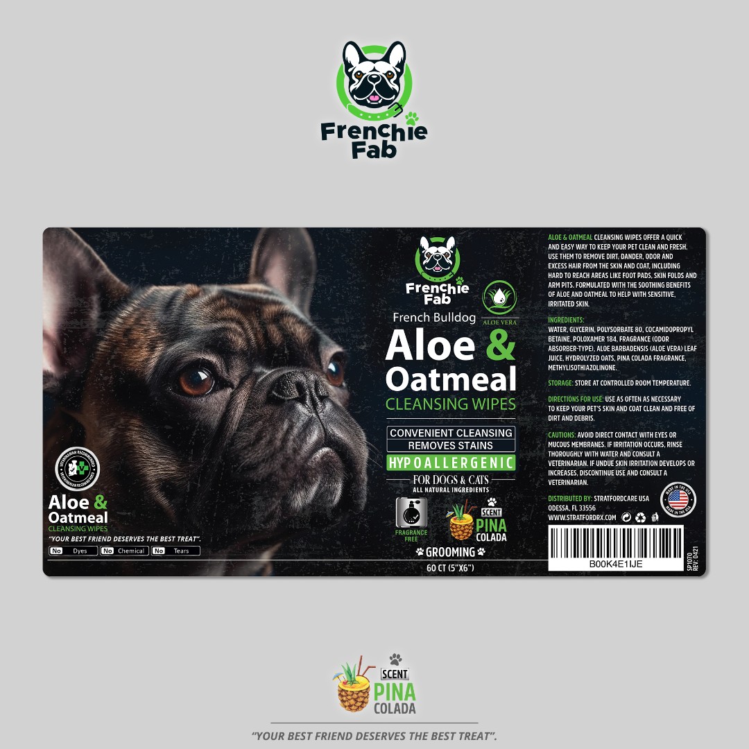 Frenchie Fab needed to create a visually appealing and informative label for their Aloe & Oatmeal Cleansing Wipes that communicates safety, natural ingredients, and suitability for both dogs and cats.