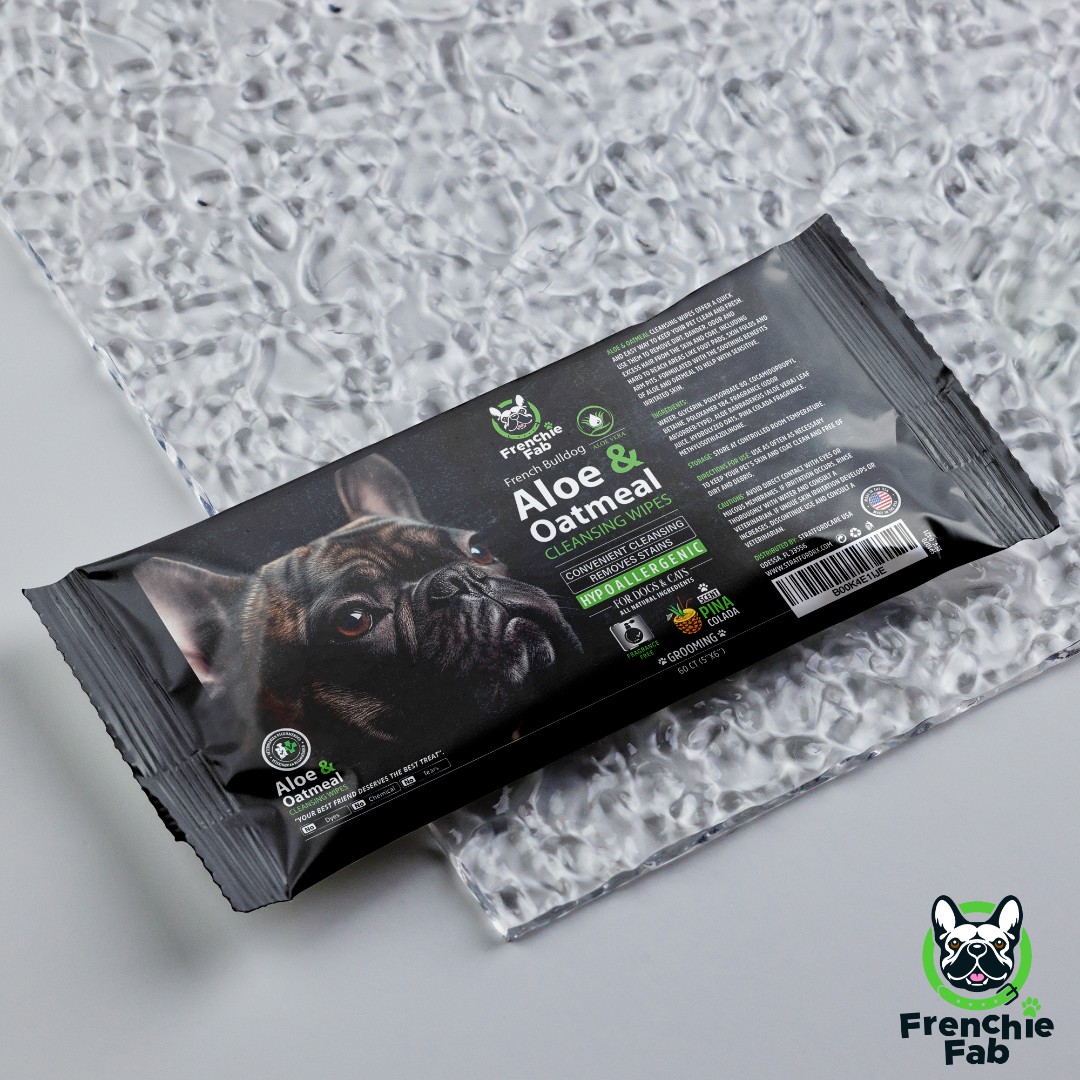 The final packaging positioned Frenchie Fab Aloe & Oatmeal Cleansing Wipes as a premium pet care solution.