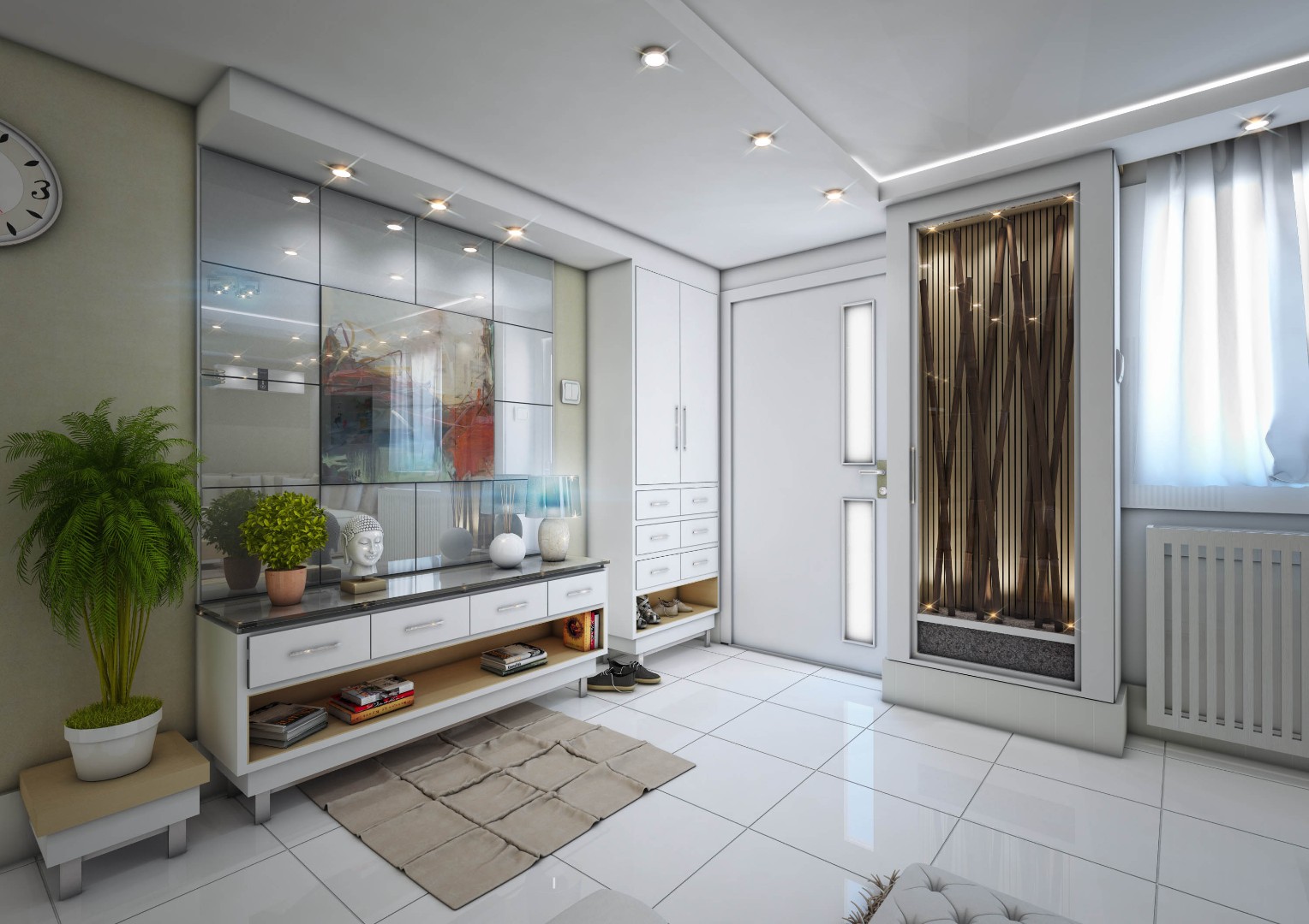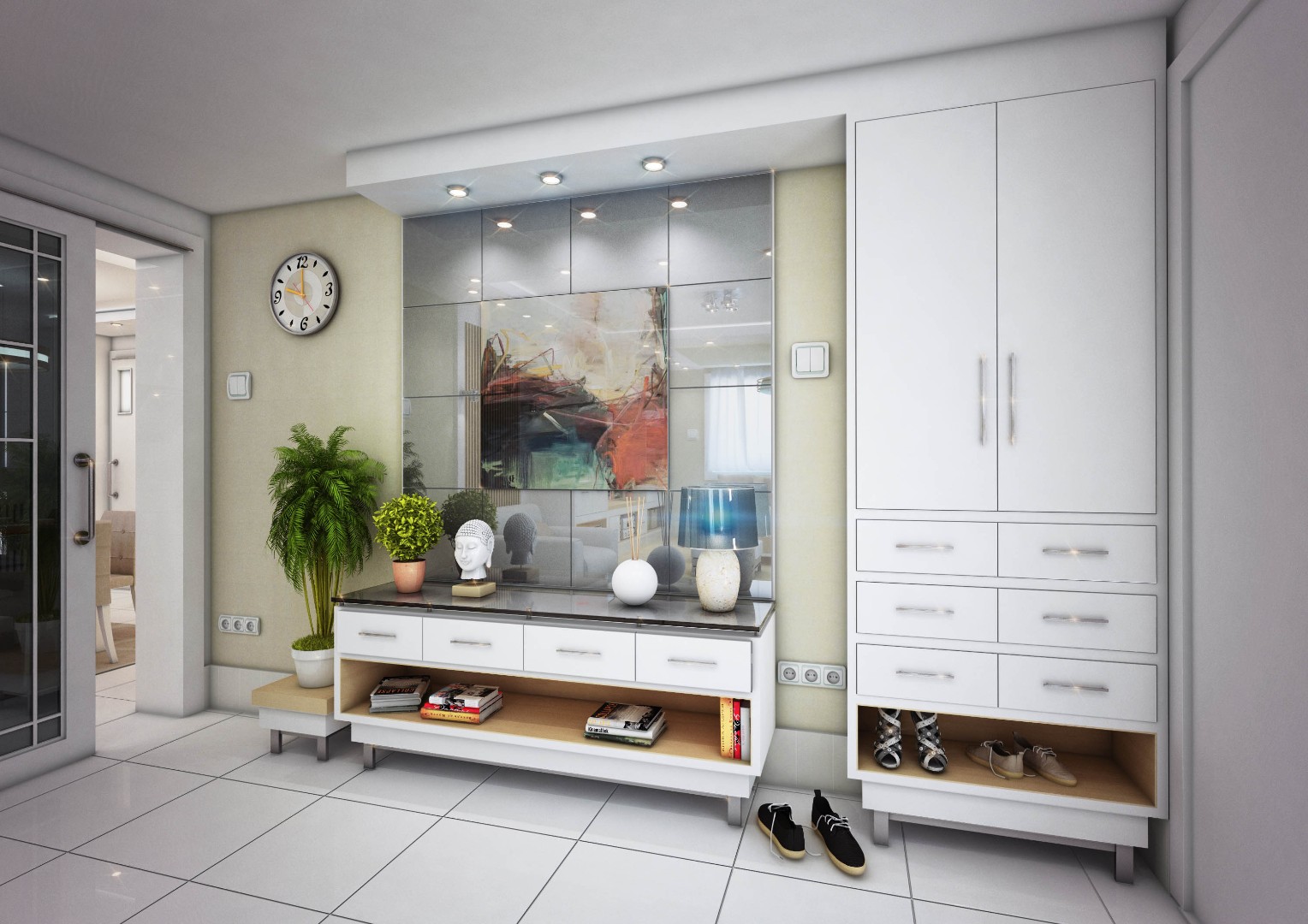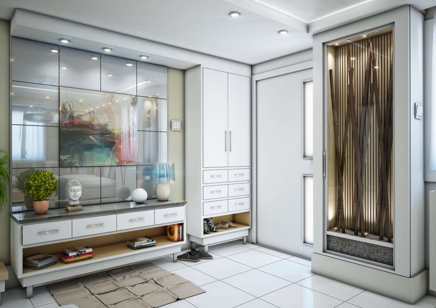 Designed hallways with built-in closets and integrated mirror elements