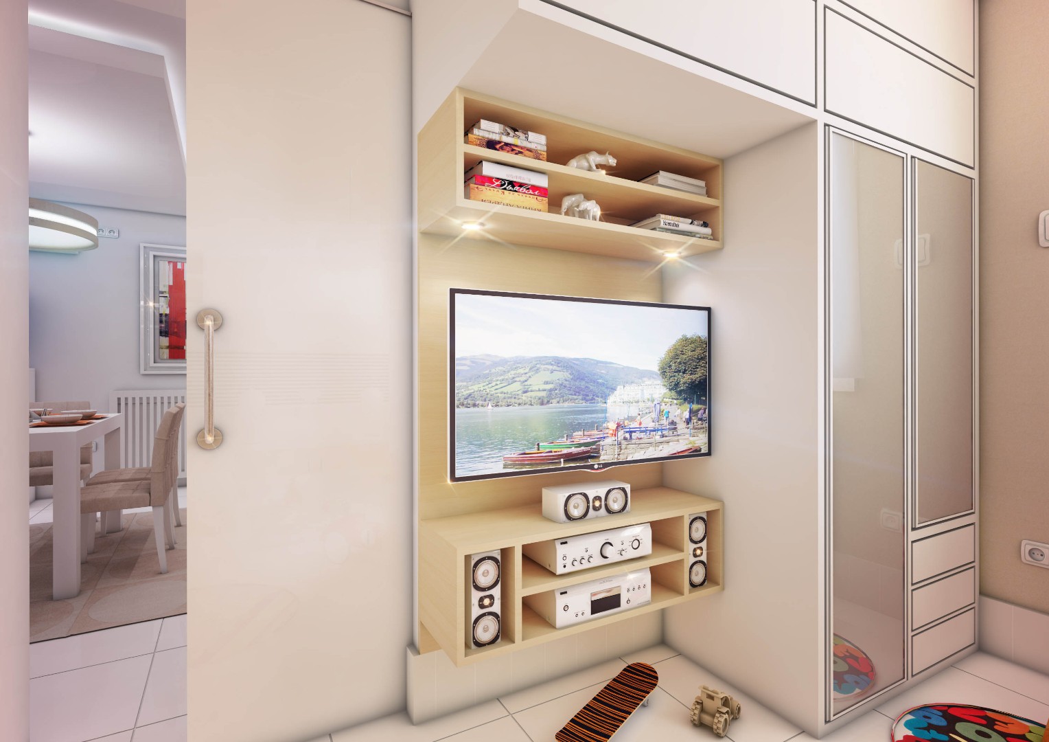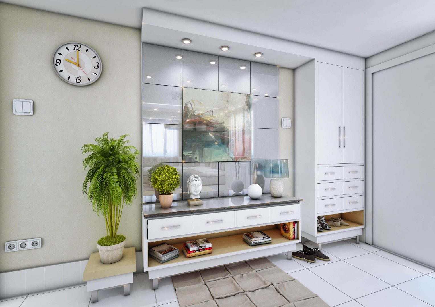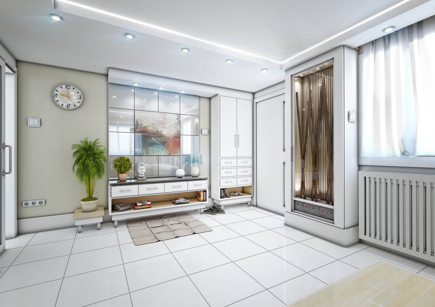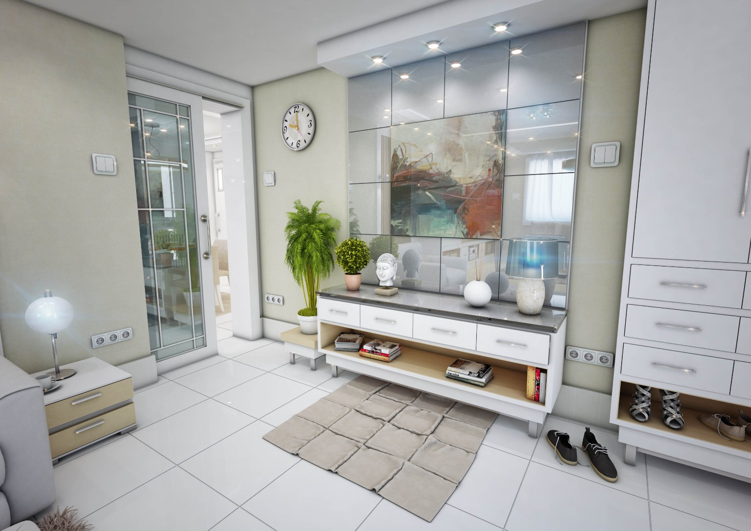 Designed hallways with built-in closets and integrated mirror elements
