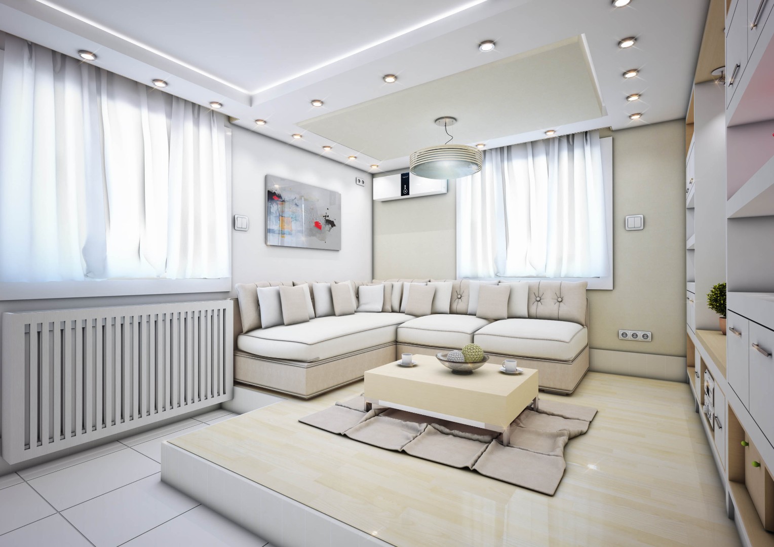 Reorganized spatial layout to create an open space living area on a raised platform