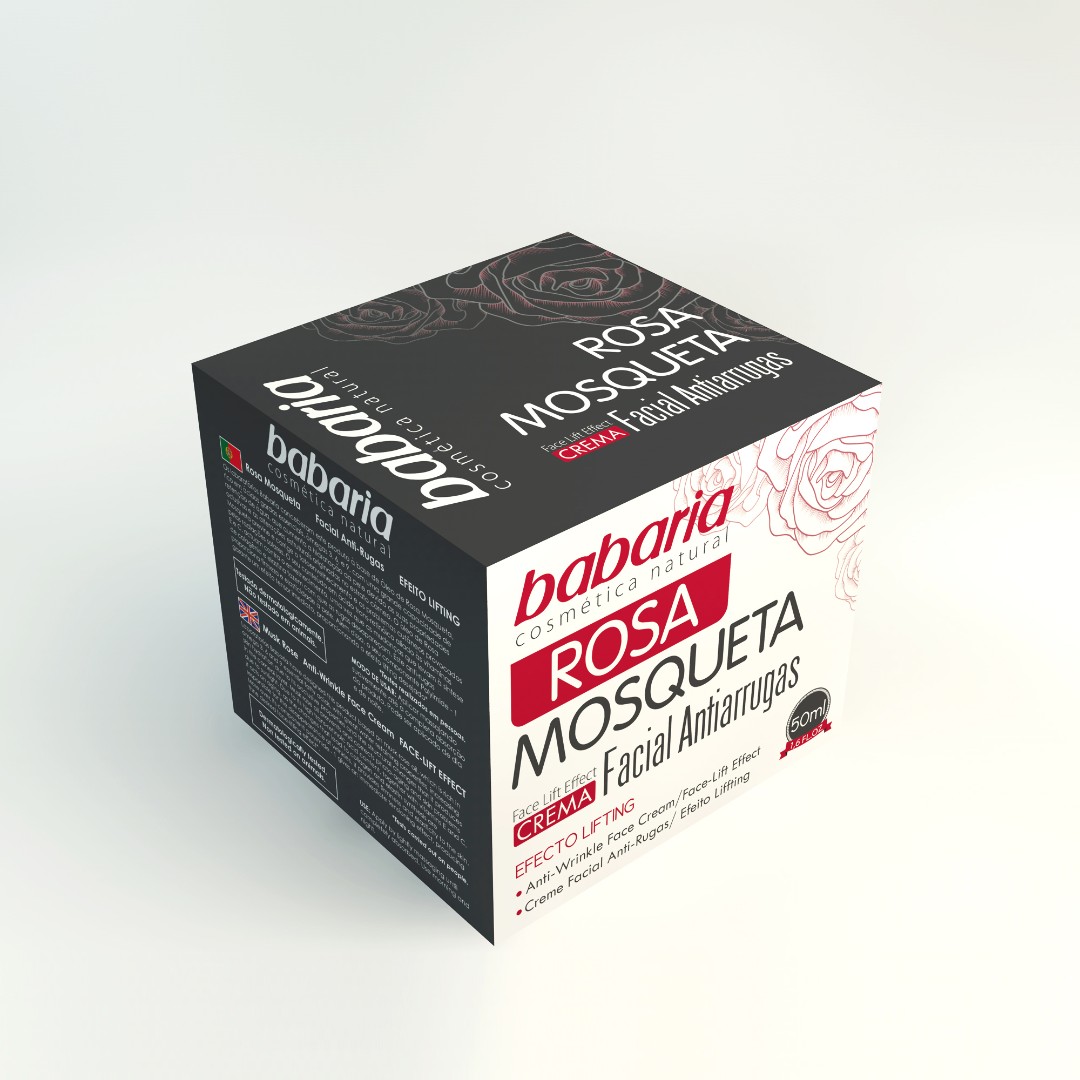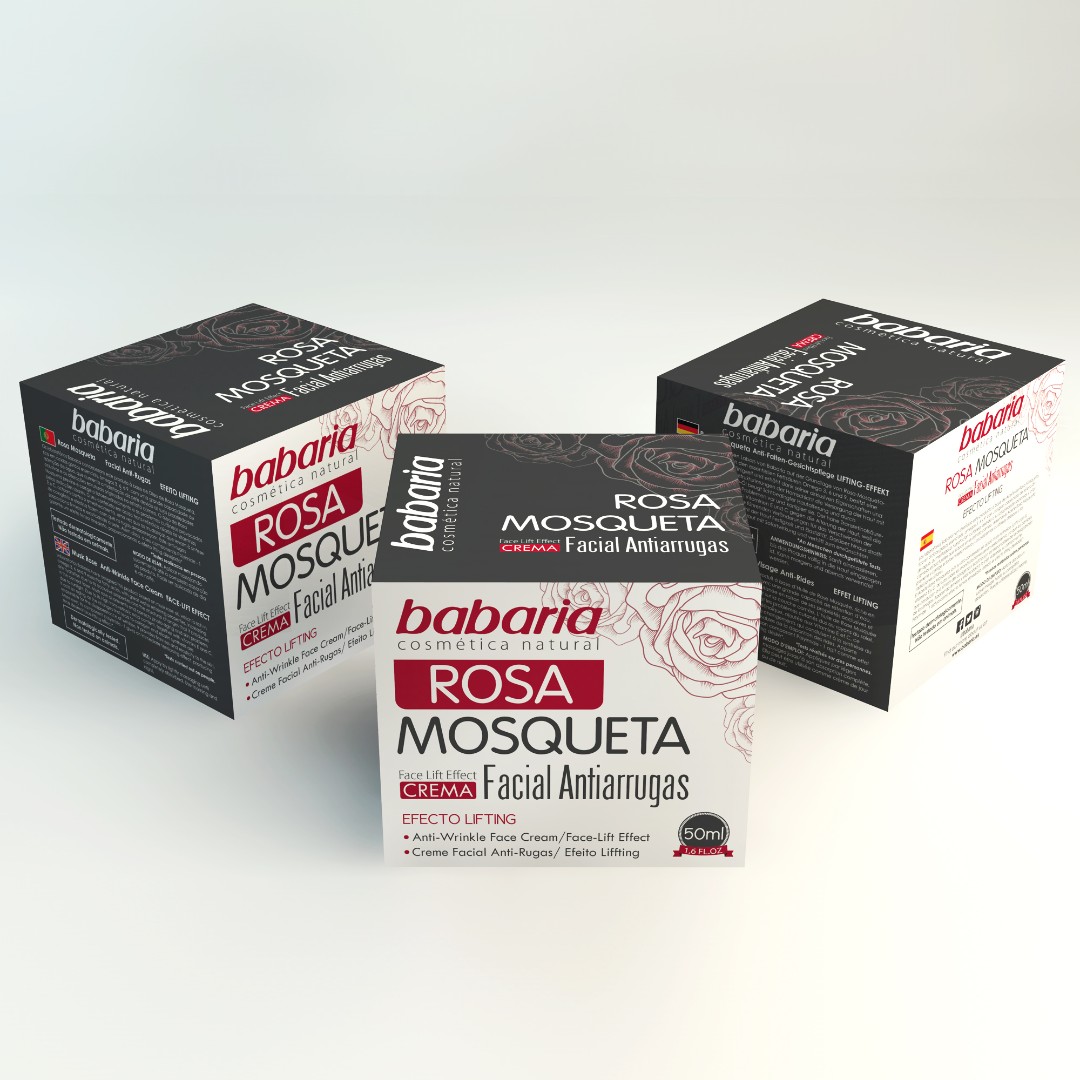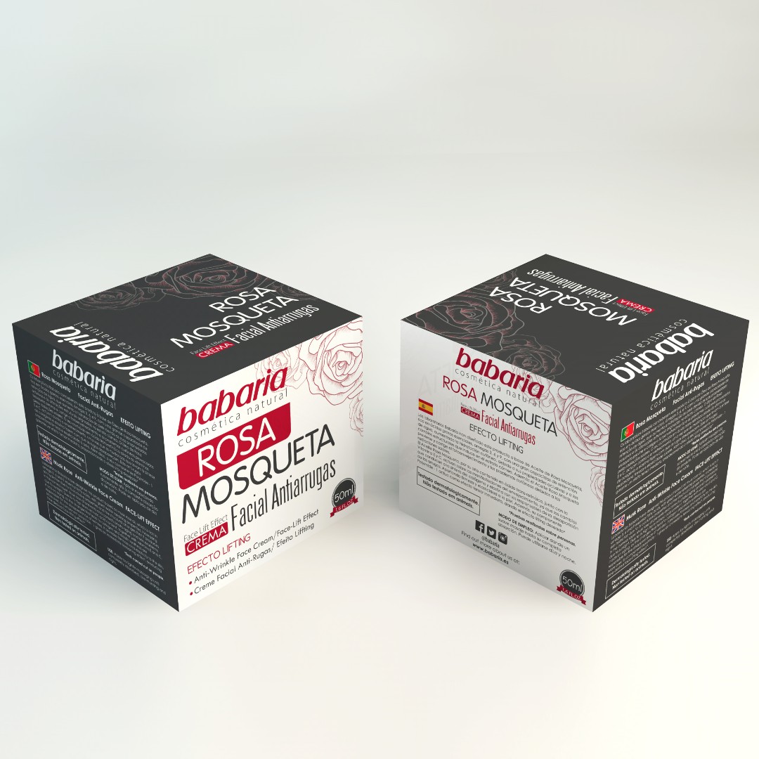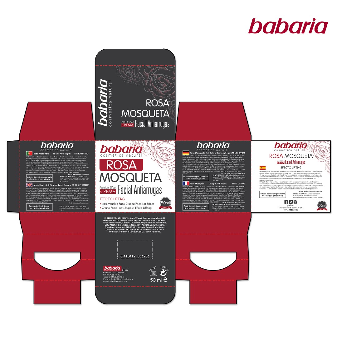Berioska, S.L. required a sophisticated and multilingual packaging design for their Babaria Rosa Mosqueta Anti-Wrinkle Face Cream that maintains brand identity while appealing to a broad European audience.