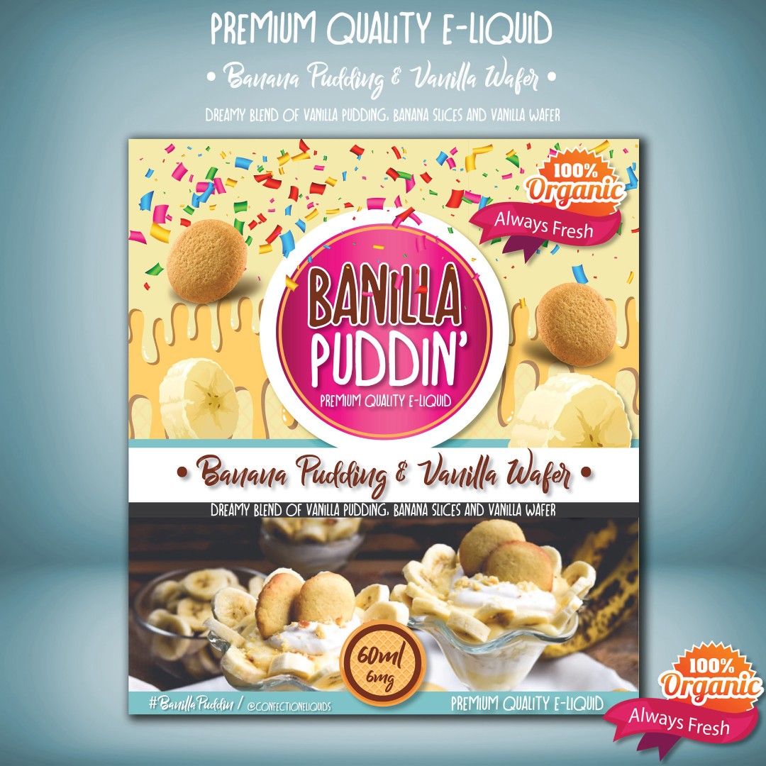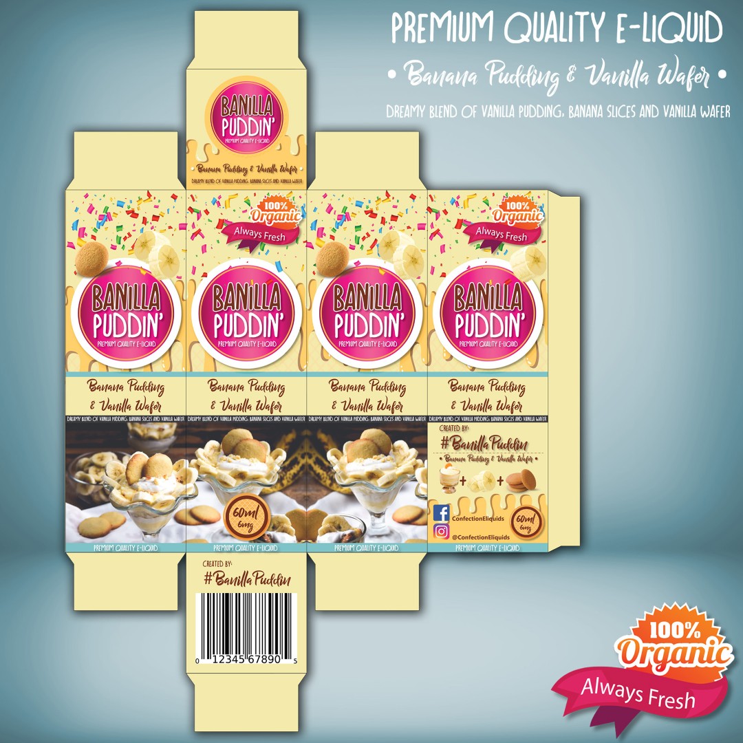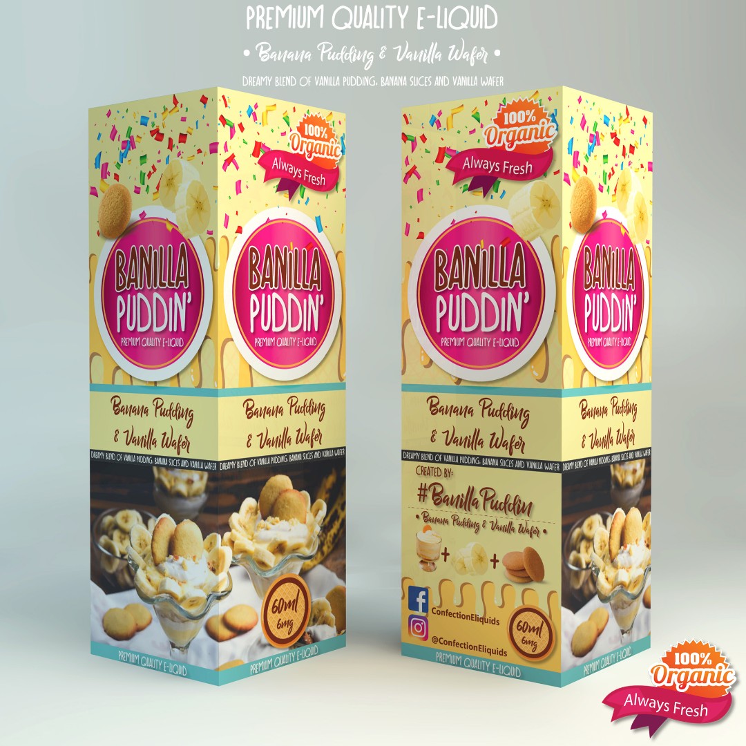 Confection Eliquids required an eye-catching and playful packaging design for their Banilla Puddin’ e-liquid that clearly communicates the dessert-inspired flavor profile while standing out in retail environments.