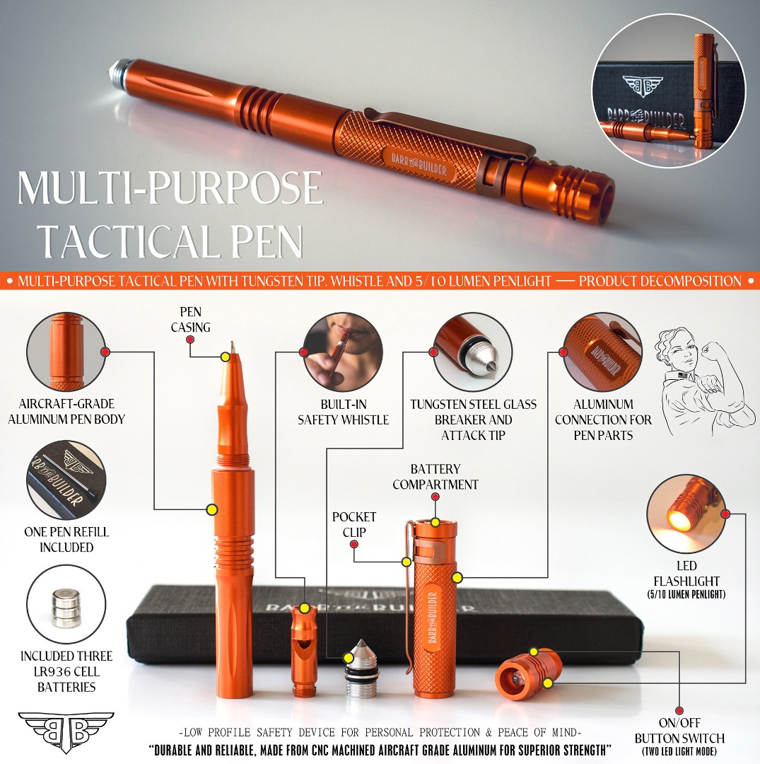 Key features of the Multi-Purpose Tactical Pen were presented through structured visual breakdowns: