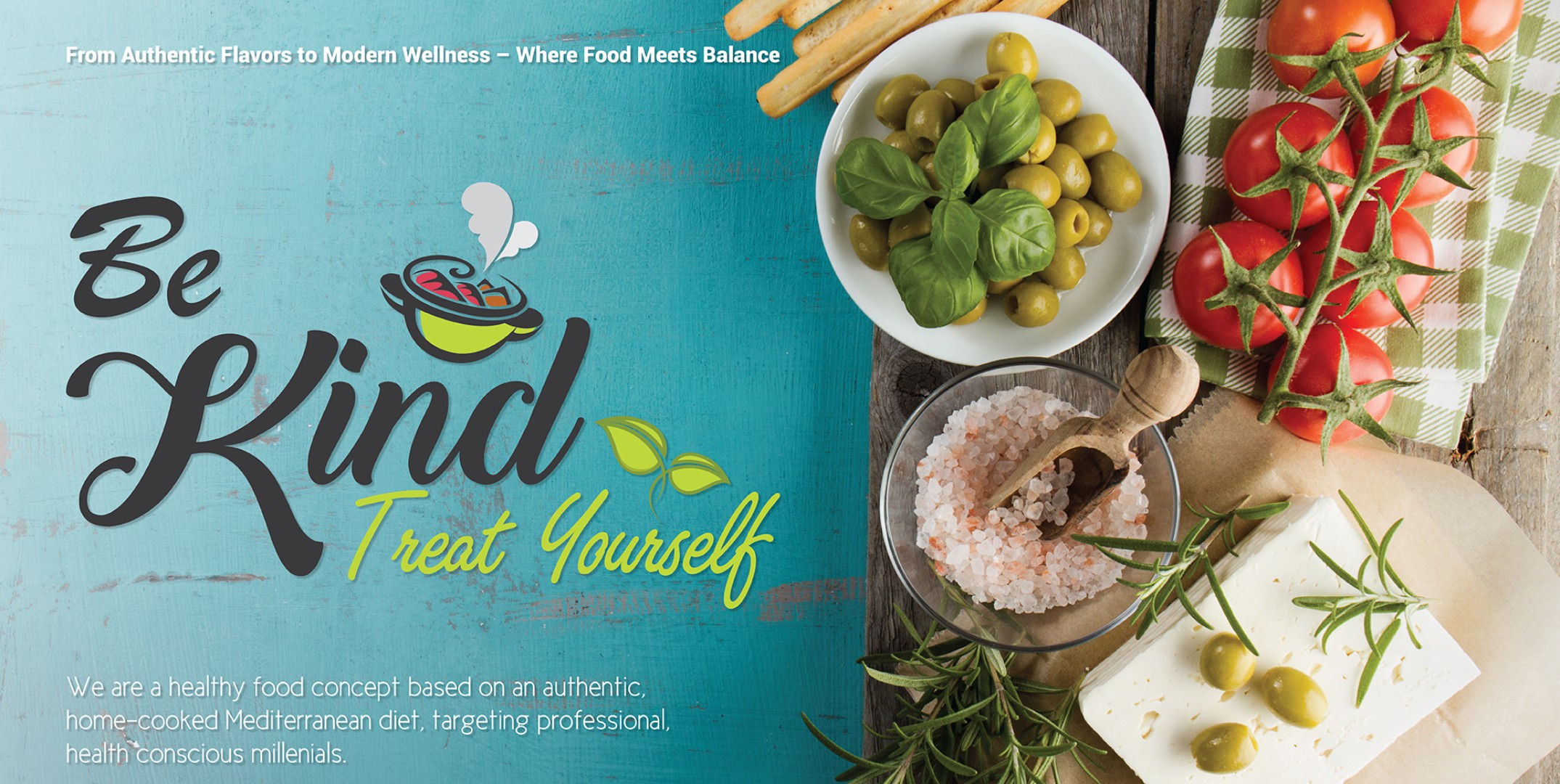 Integrated minimalist food imagery, such as a steaming bowl of Mediterranean-inspired ingredients, emphasizing home-cooked goodness.