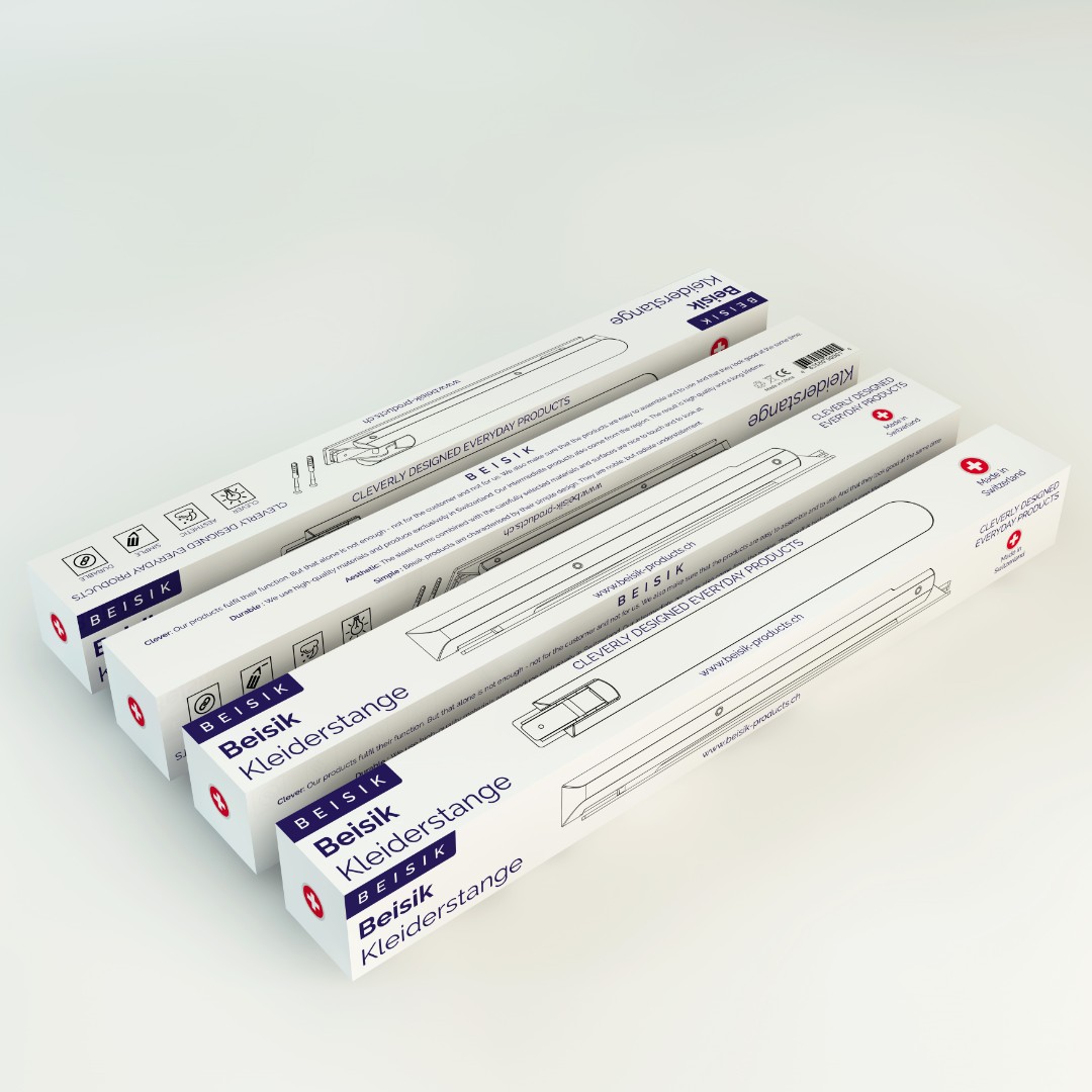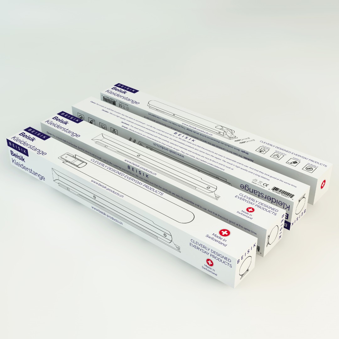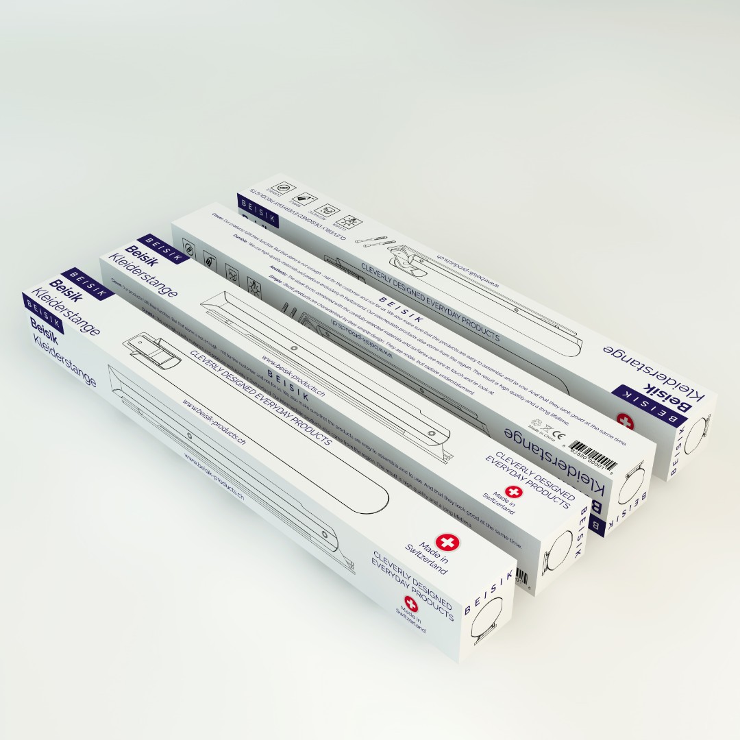 Beisik Products required a premium packaging design for their wall-mounted clothes rail that reflects minimalist aesthetics and Swiss-made quality while remaining production-ready.
