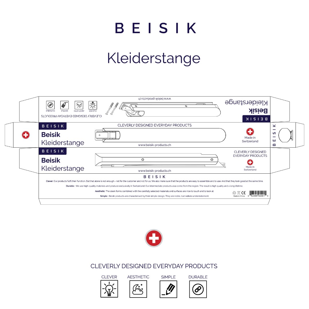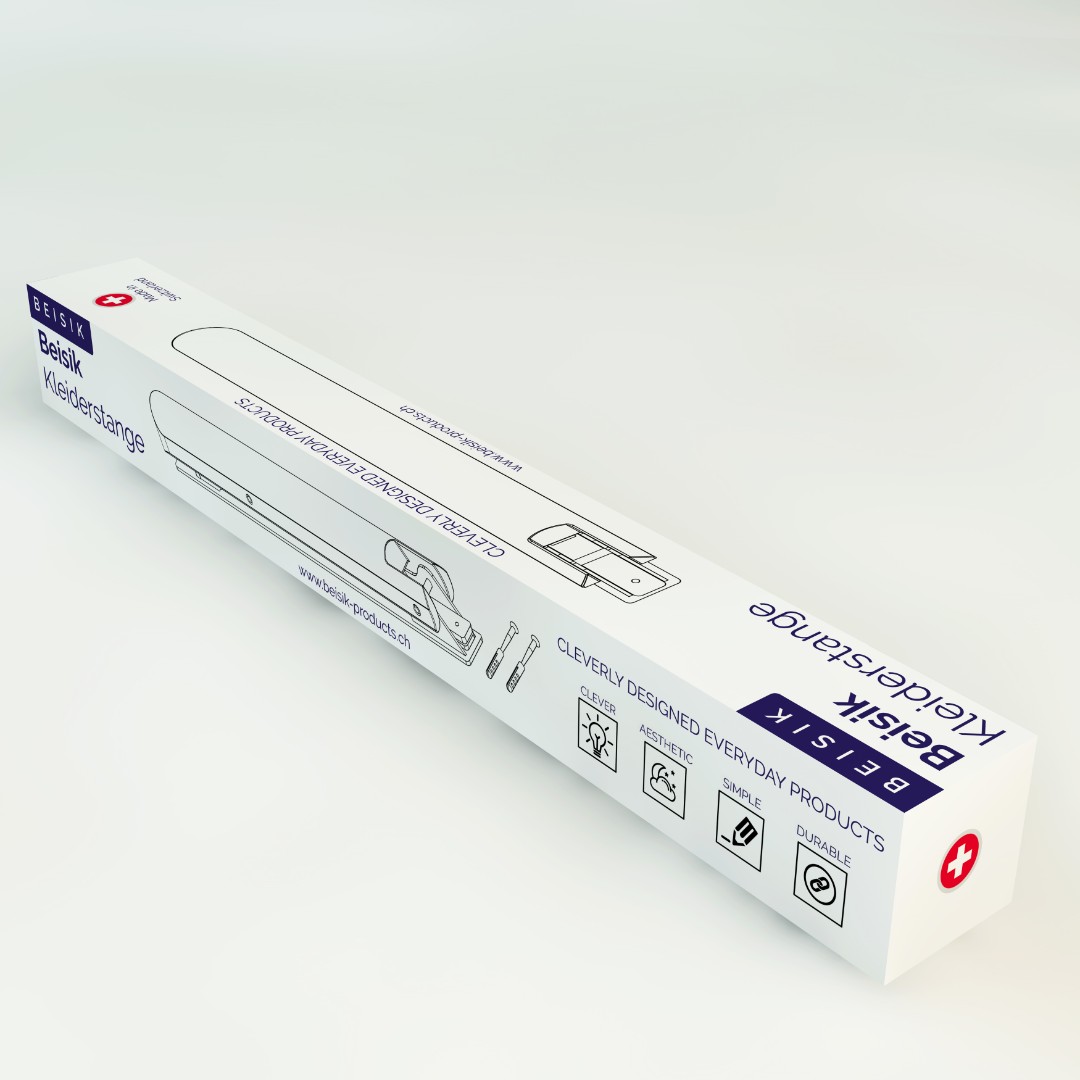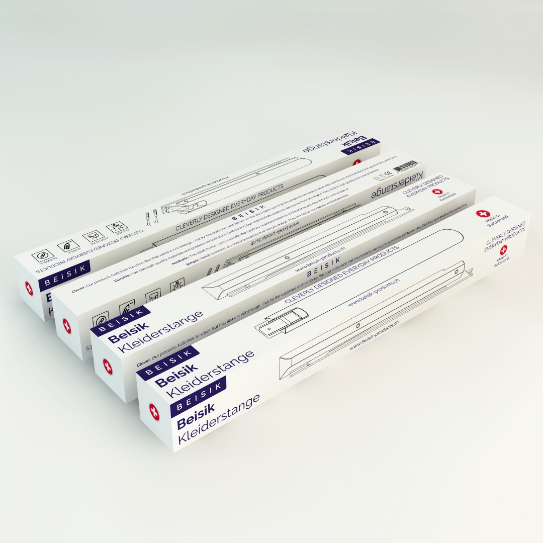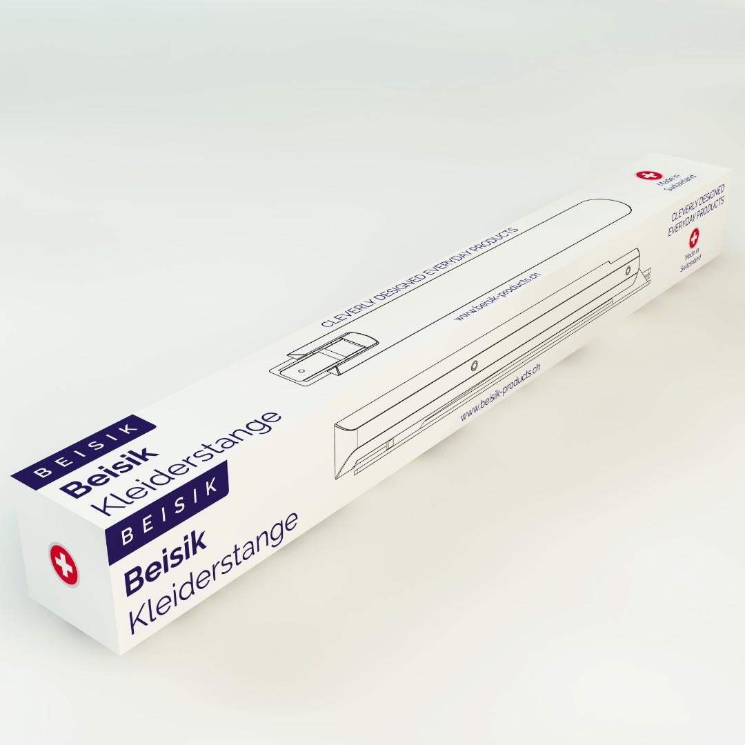 Beisik Products required a premium packaging design for their wall-mounted clothes rail that reflects minimalist aesthetics and Swiss-made quality while remaining production-ready.