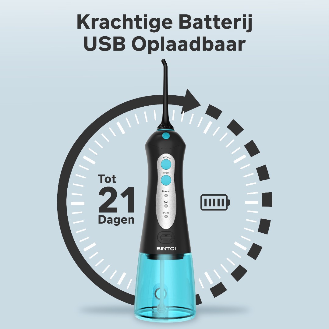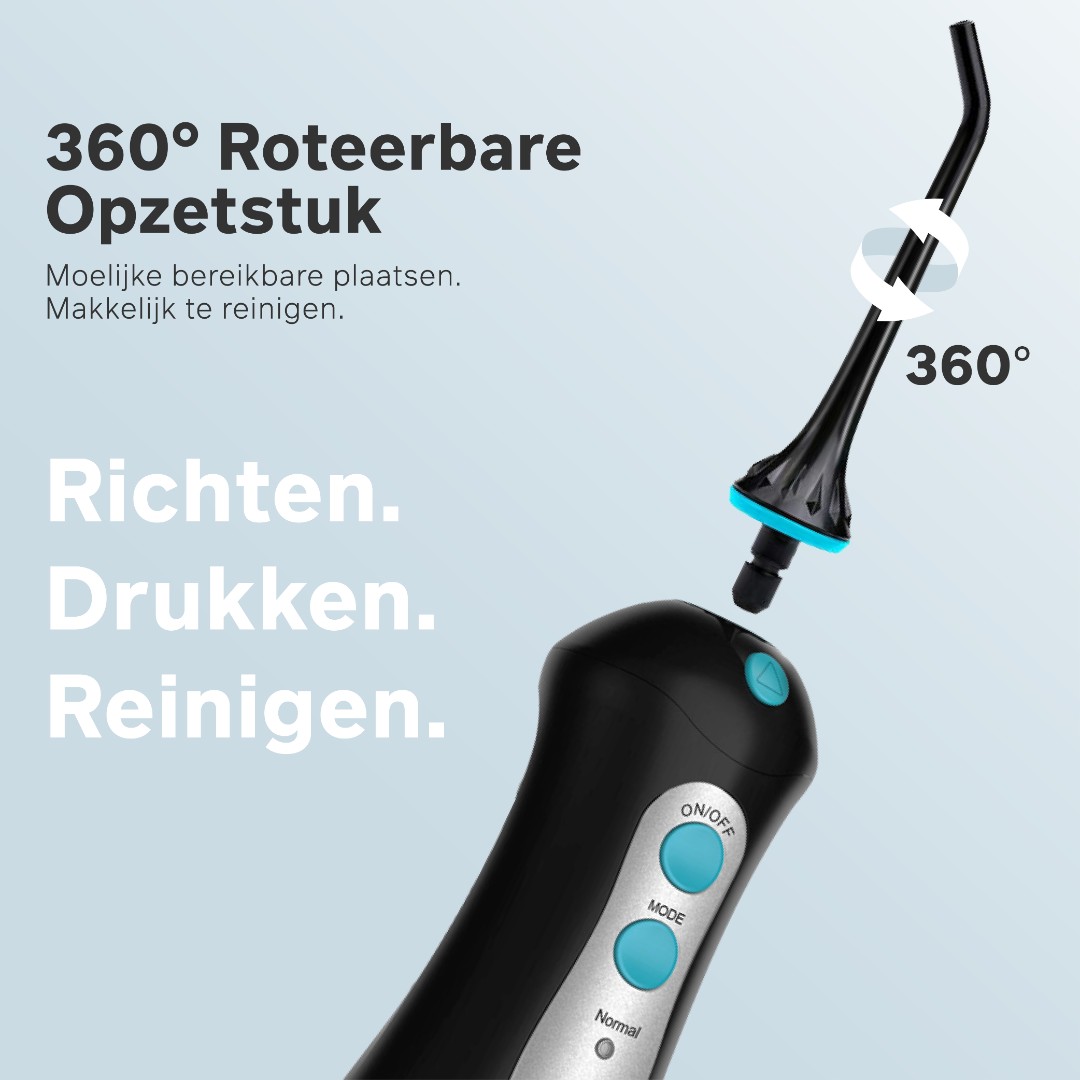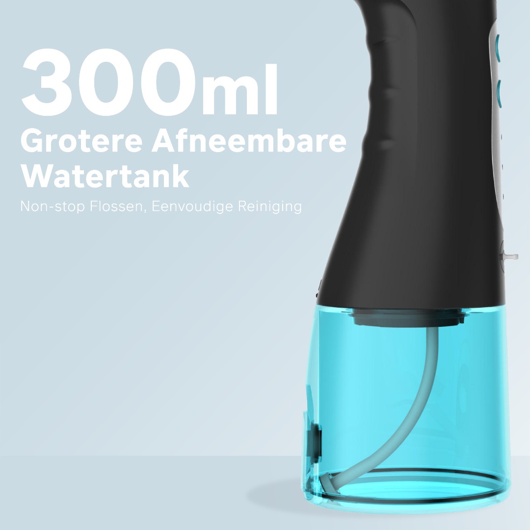 Highlighted key product features such as 300ml water tank capacity, IPX7 waterproof rating, USB rechargeable battery lasting up to 21 days, 360° rotating nozzle, and three flossing modes: Normal, Soft, and Pulse