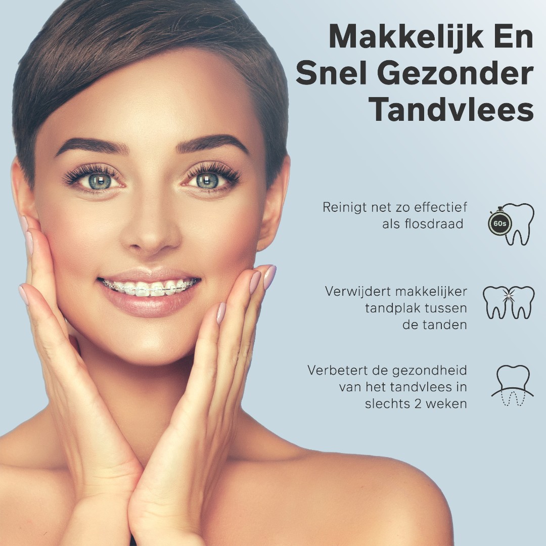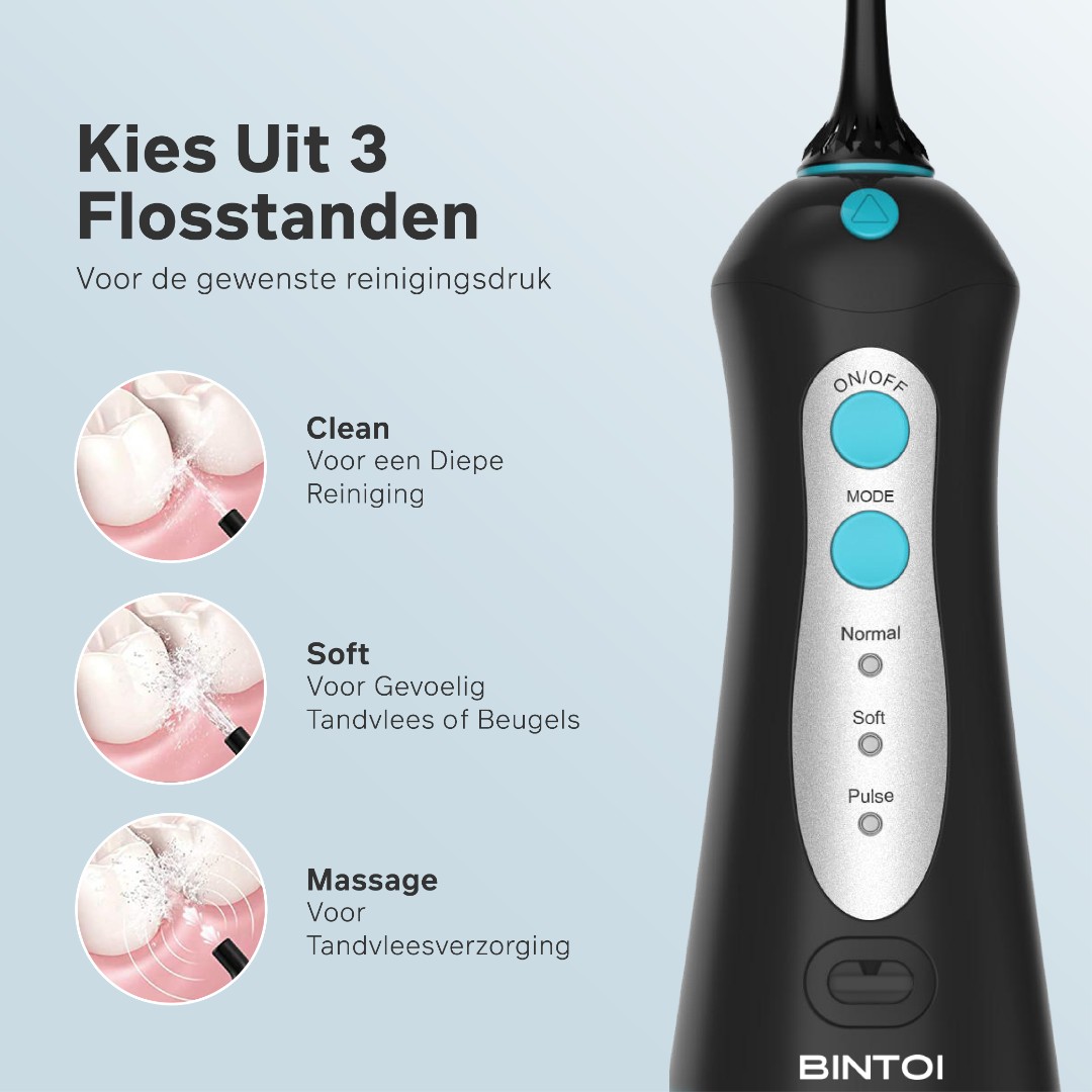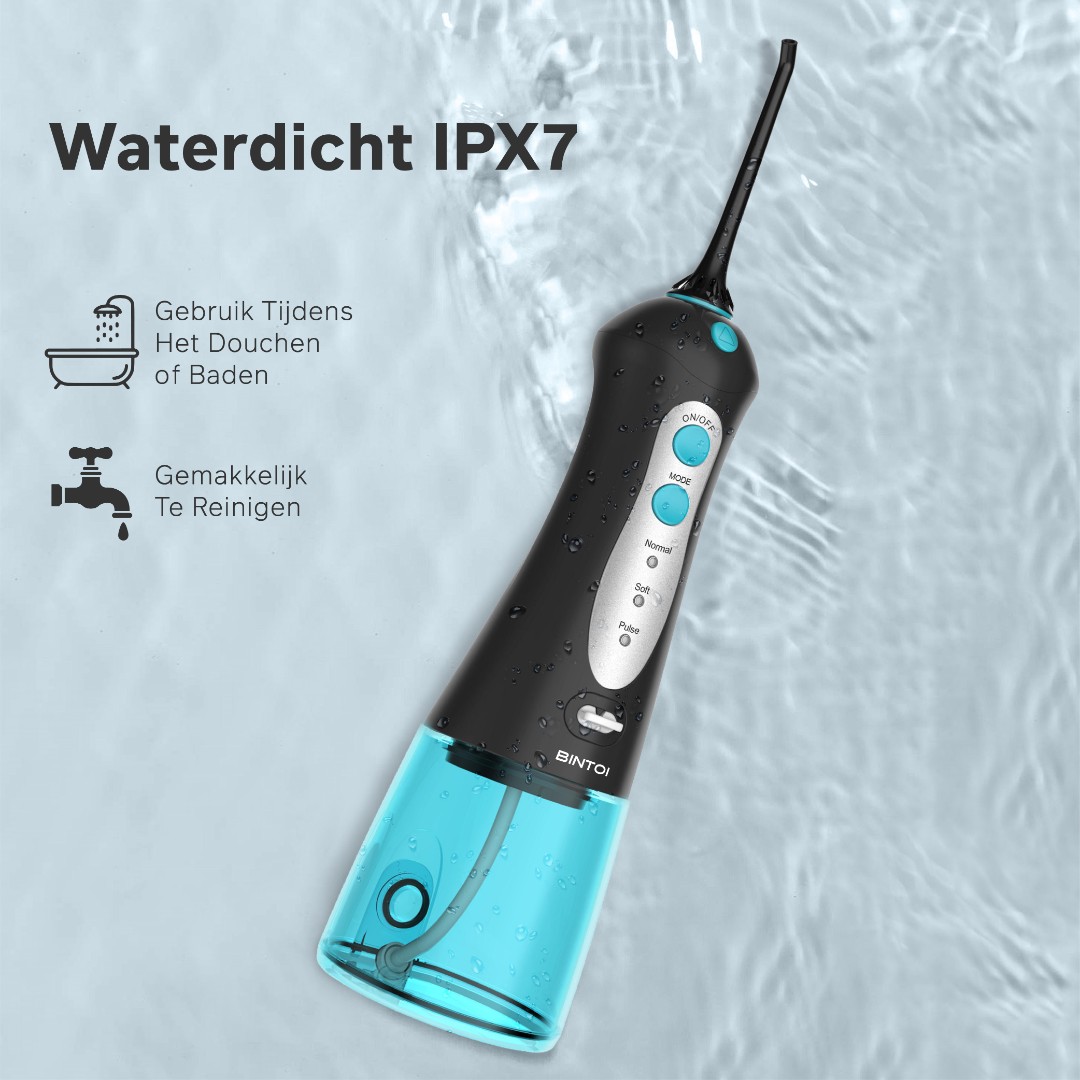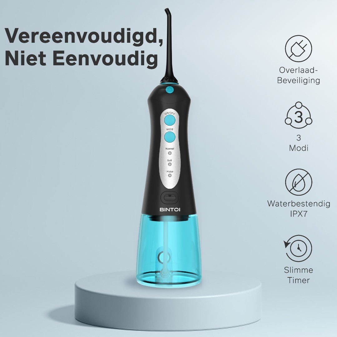 Highlighted key product features such as 300ml water tank capacity, IPX7 waterproof rating, USB rechargeable battery lasting up to 21 days, 360° rotating nozzle, and three flossing modes: Normal, Soft, and Pulse
