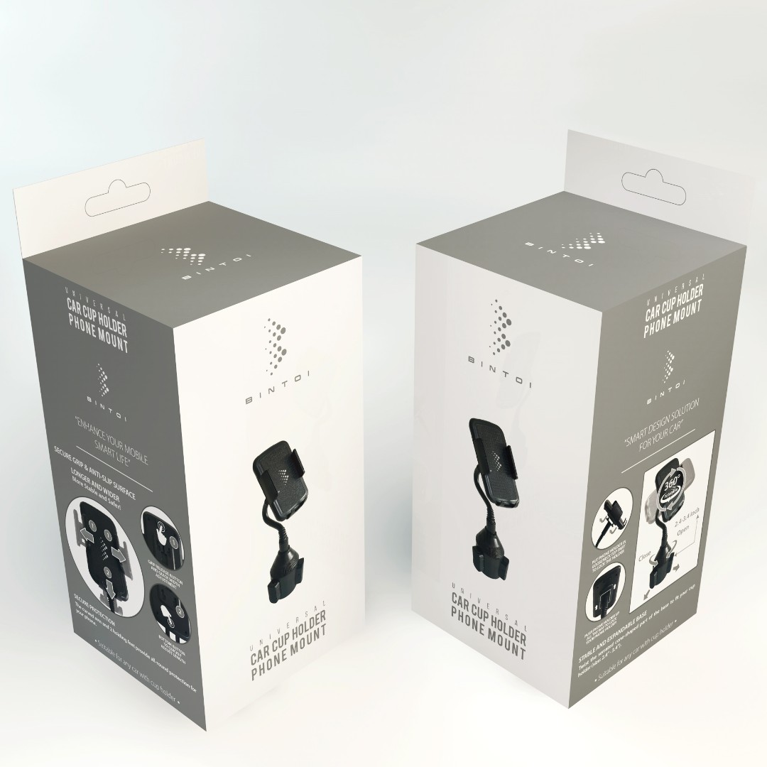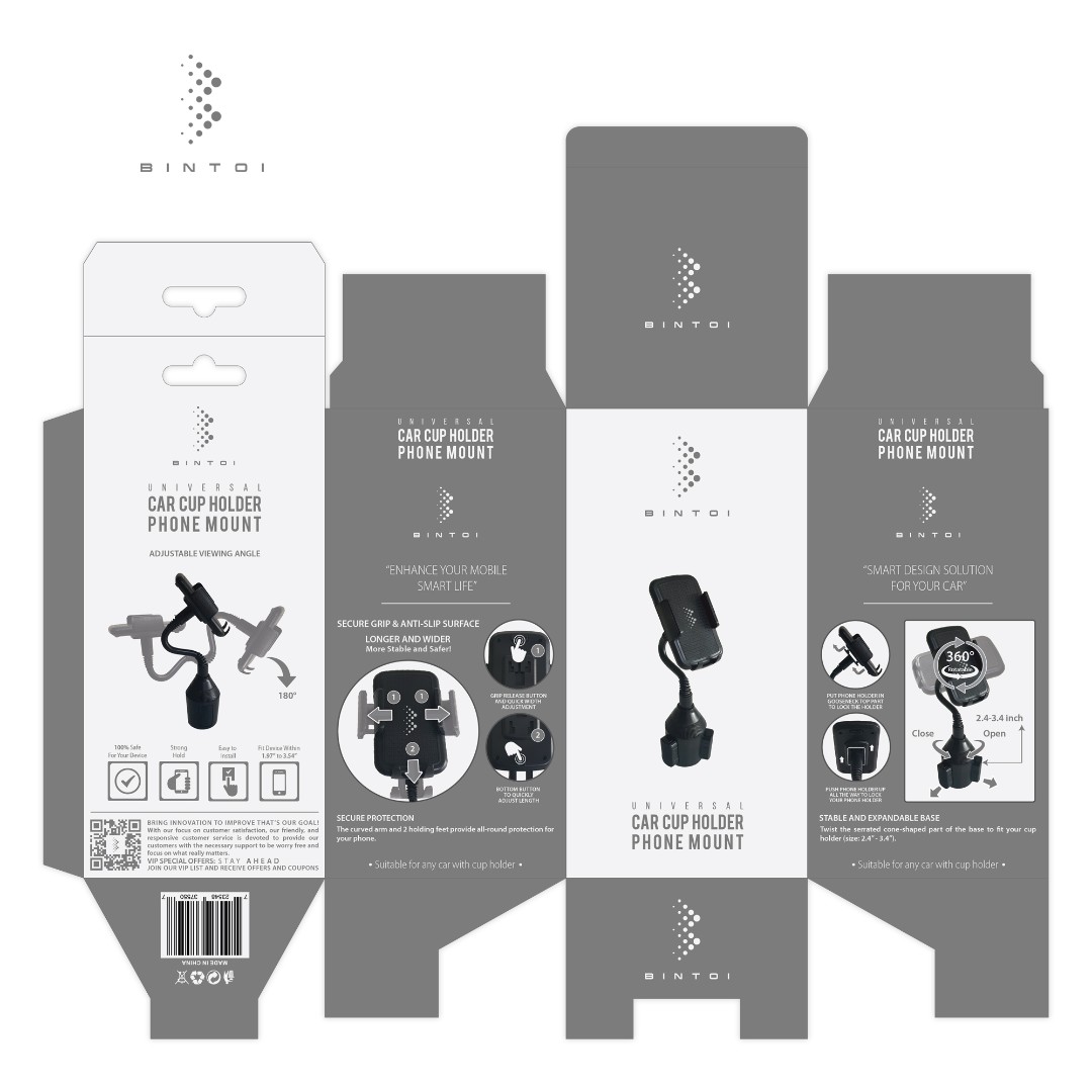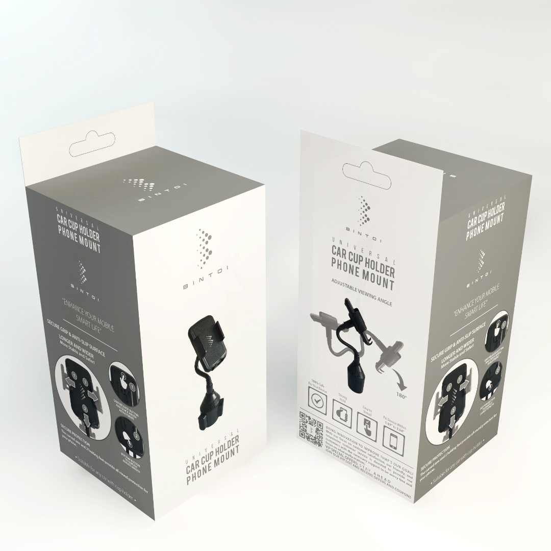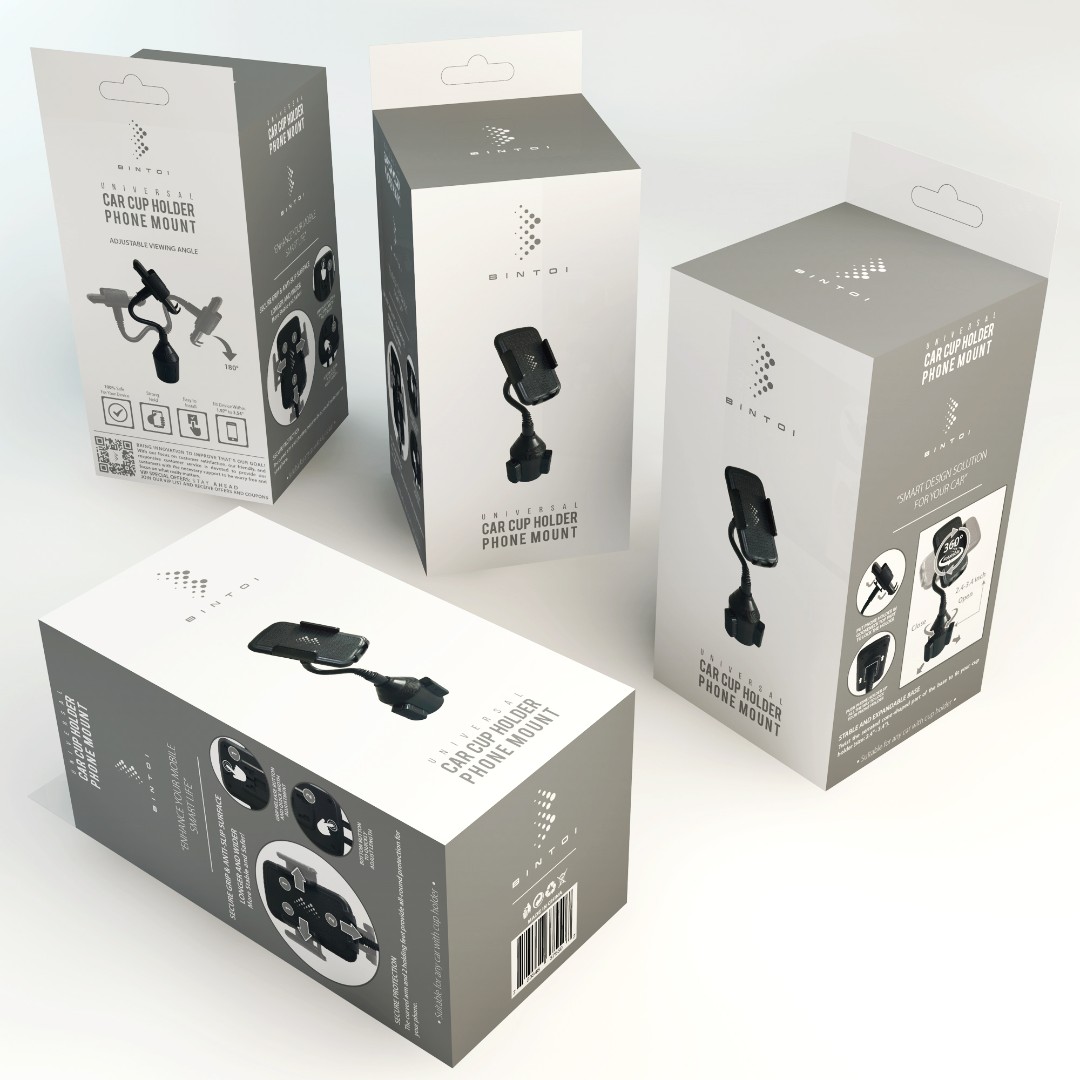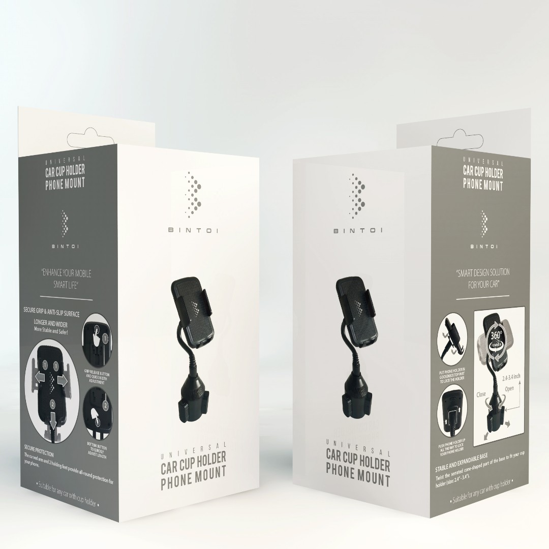 Amelio TG required a world-class packaging design for the Bintoi Universal Car Cup Holder Phone Mount that reflects its premium quality and practical functionality.