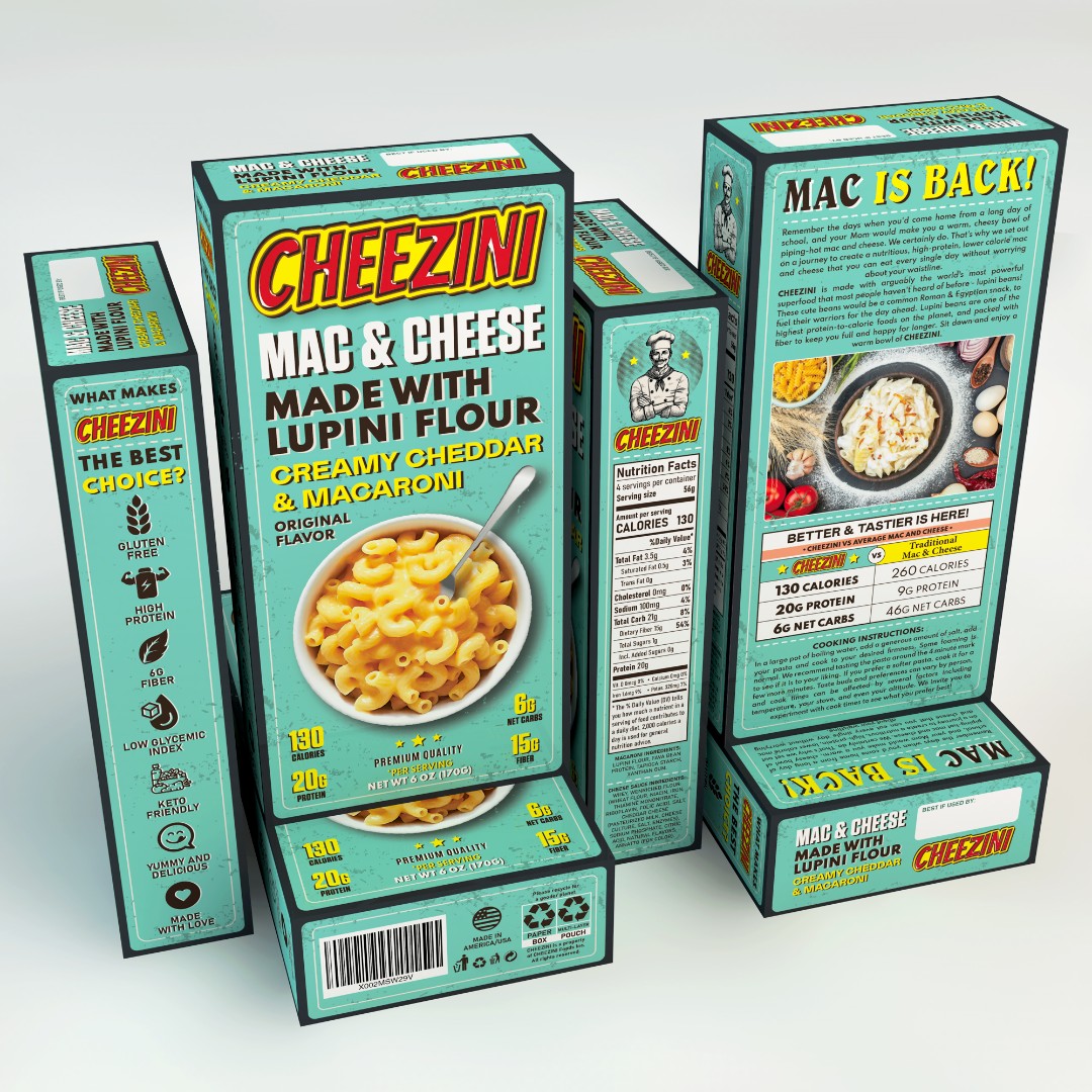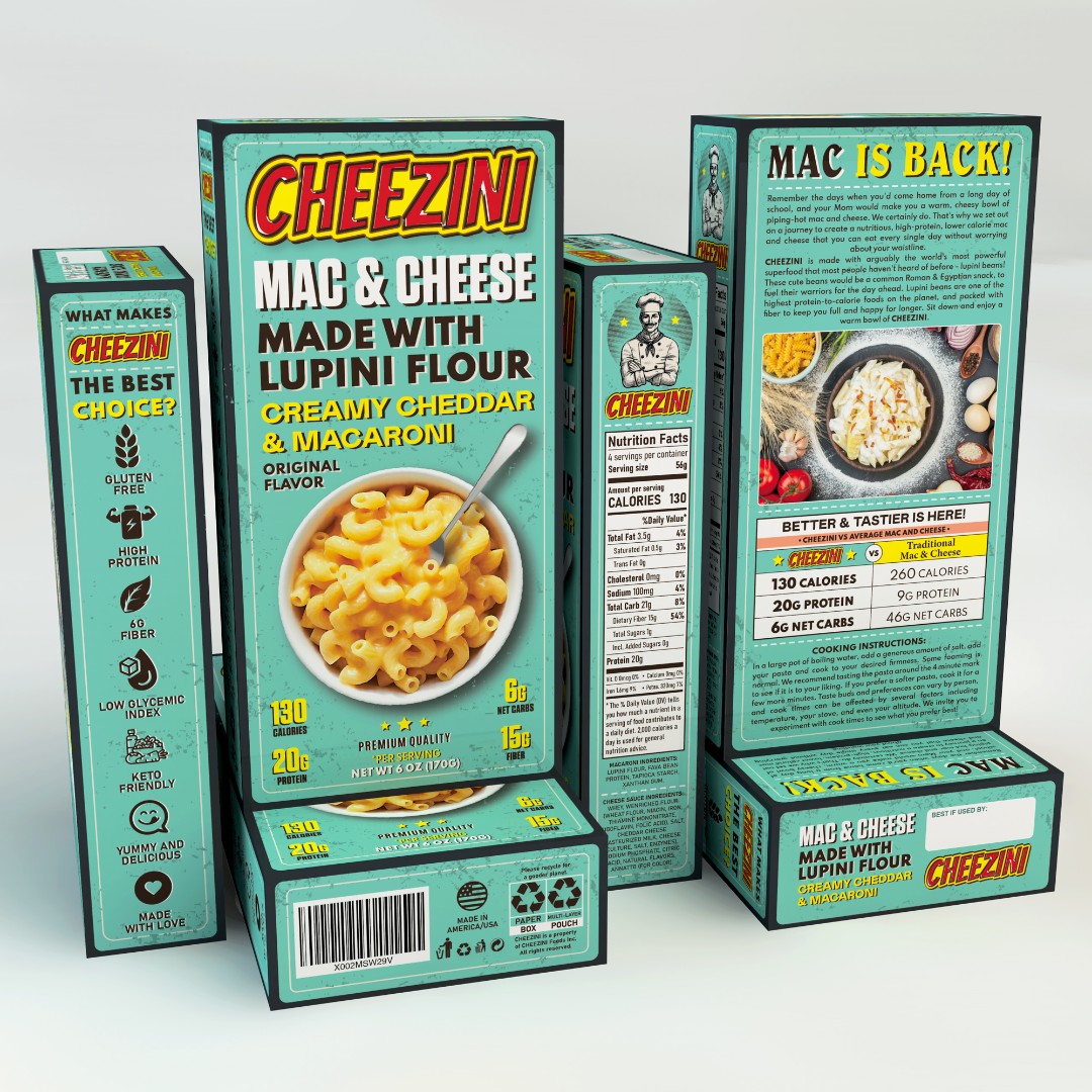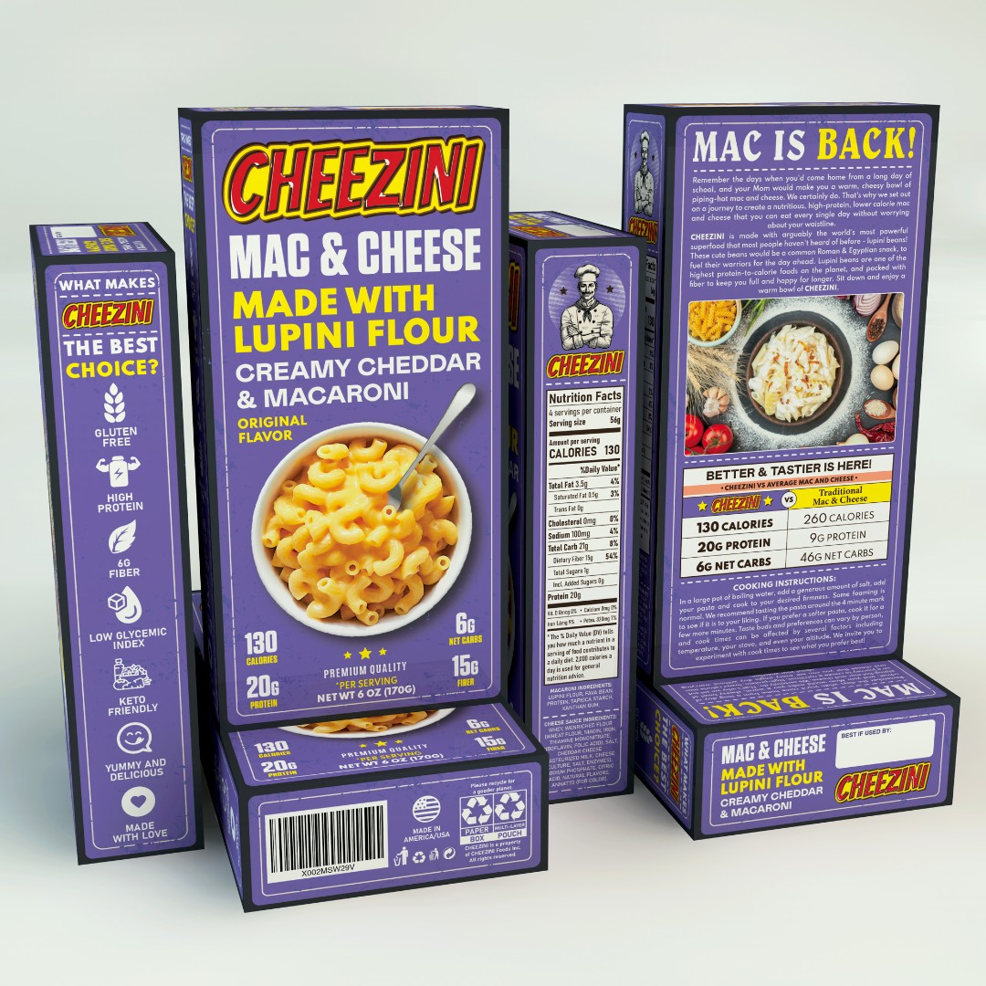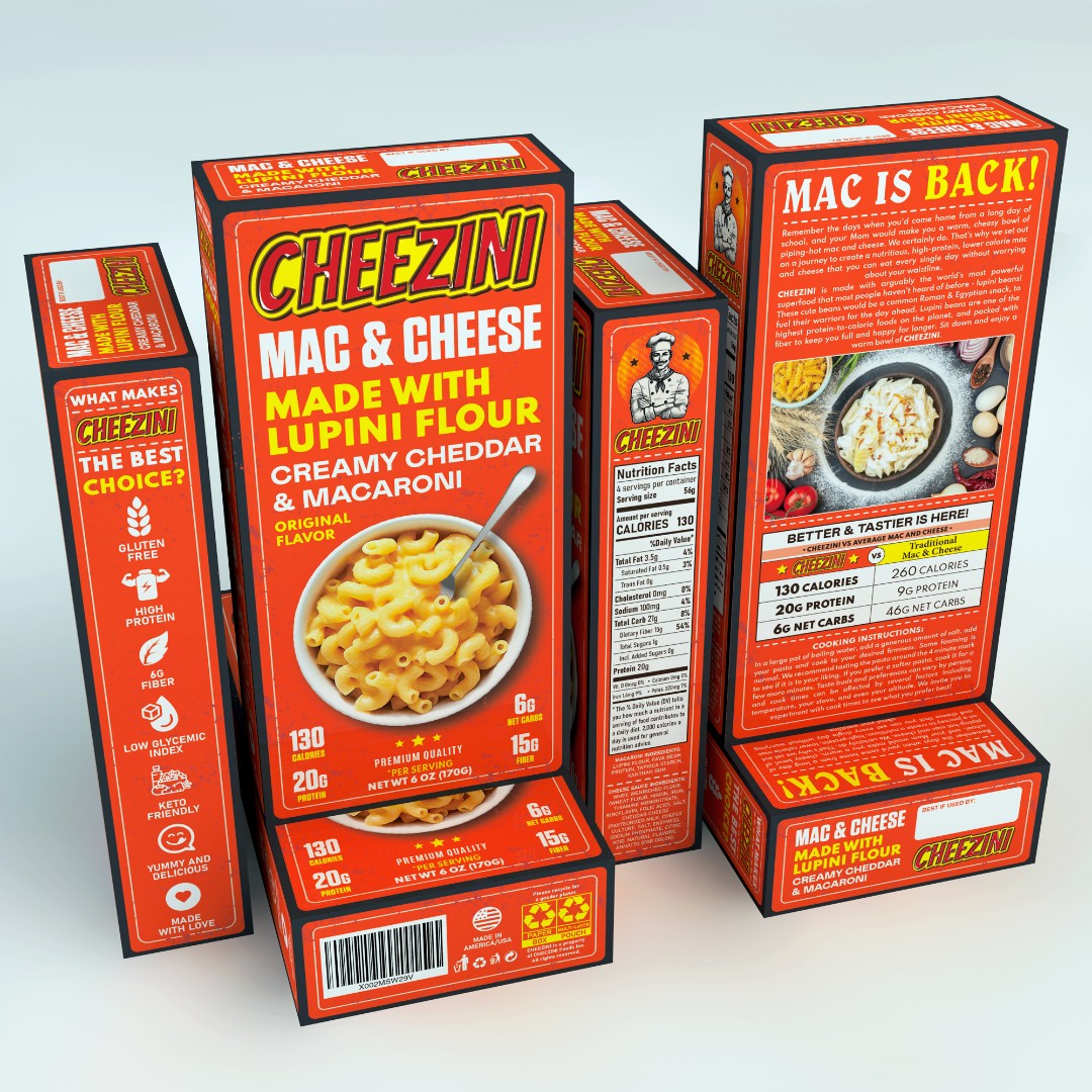 The Cheezini Mac & Cheese packaging required a visually distinctive design that combines nostalgic appeal with modern health-focused messaging.