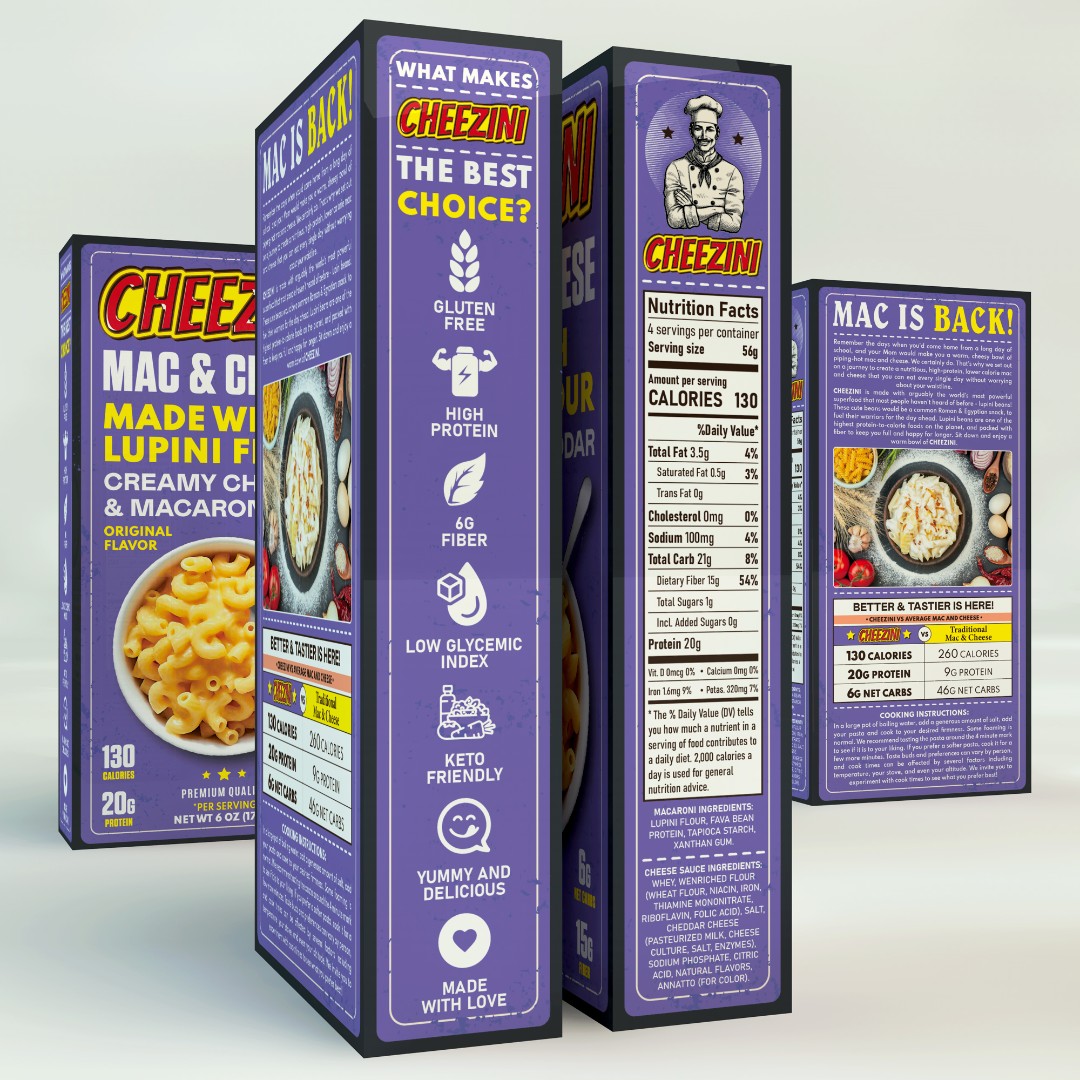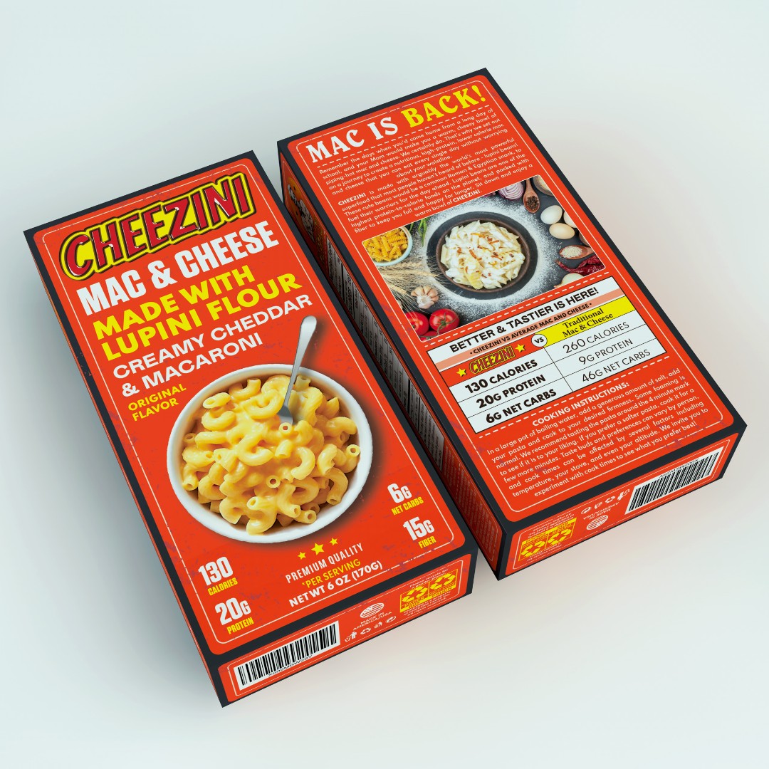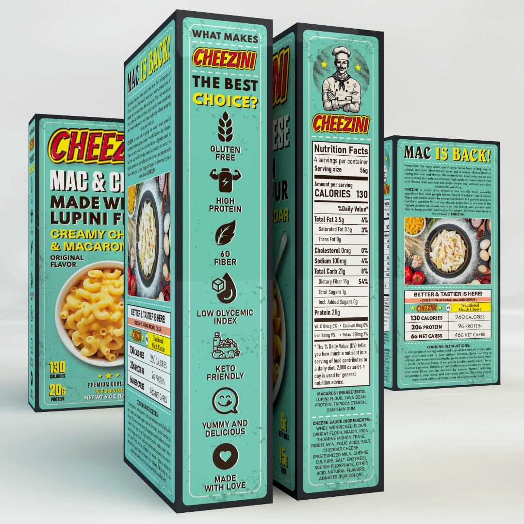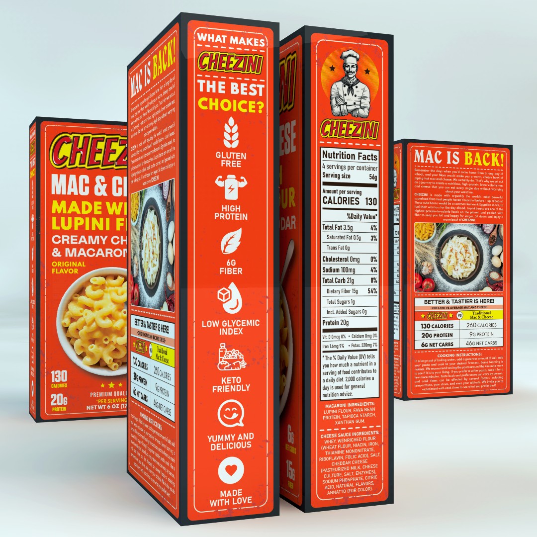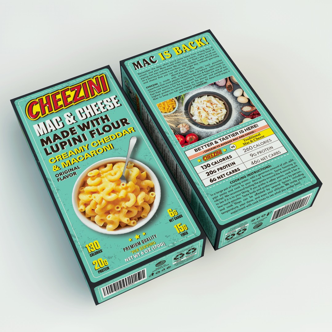 The Cheezini Mac & Cheese packaging required a visually distinctive design that combines nostalgic appeal with modern health-focused messaging.