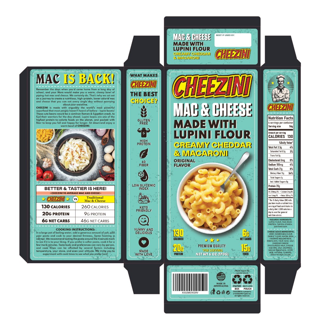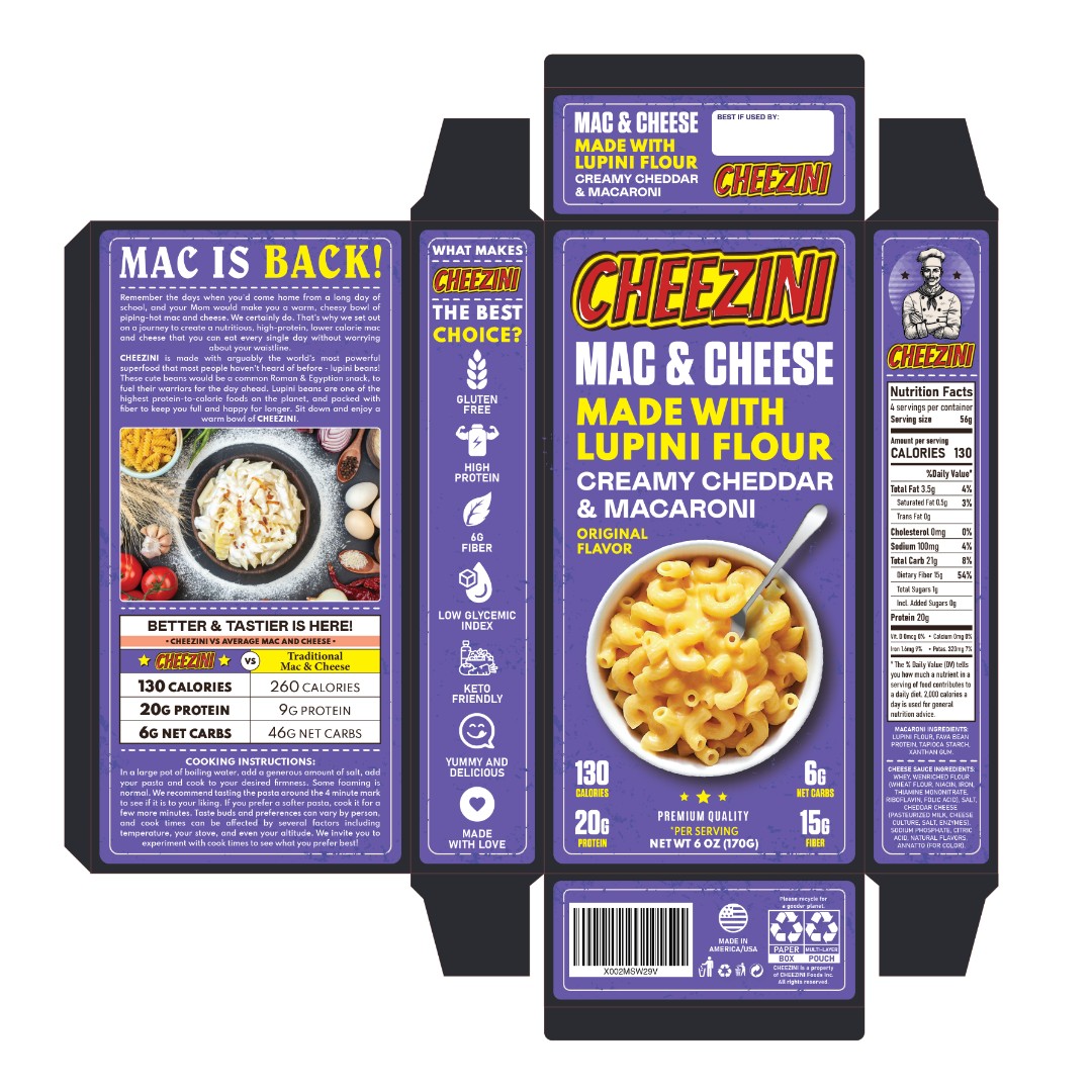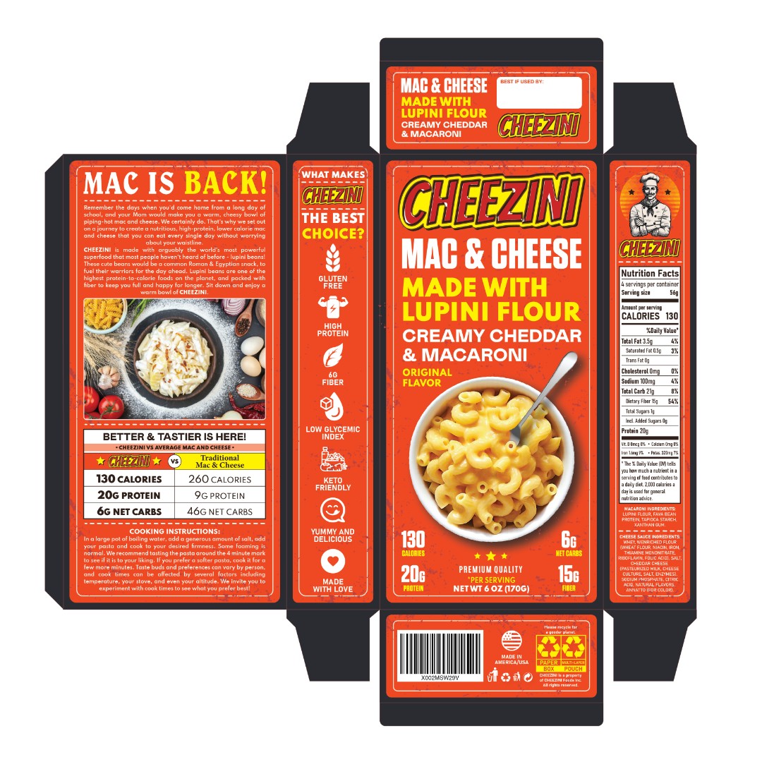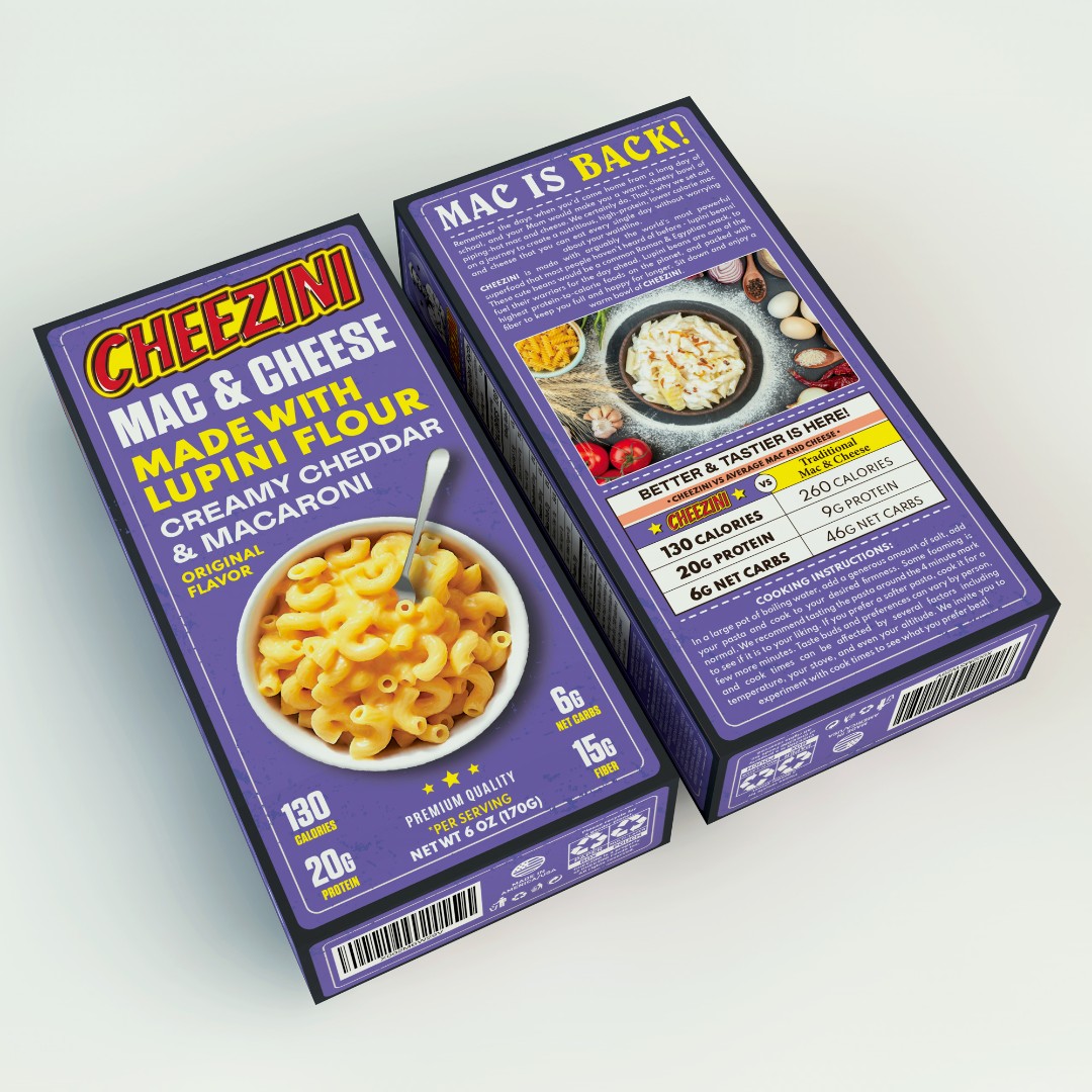 The Cheezini Mac & Cheese packaging required a visually distinctive design that combines nostalgic appeal with modern health-focused messaging.
