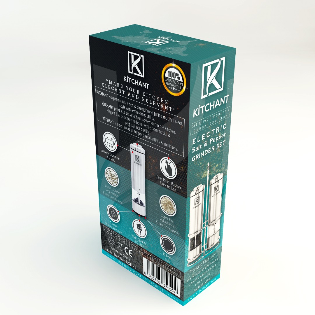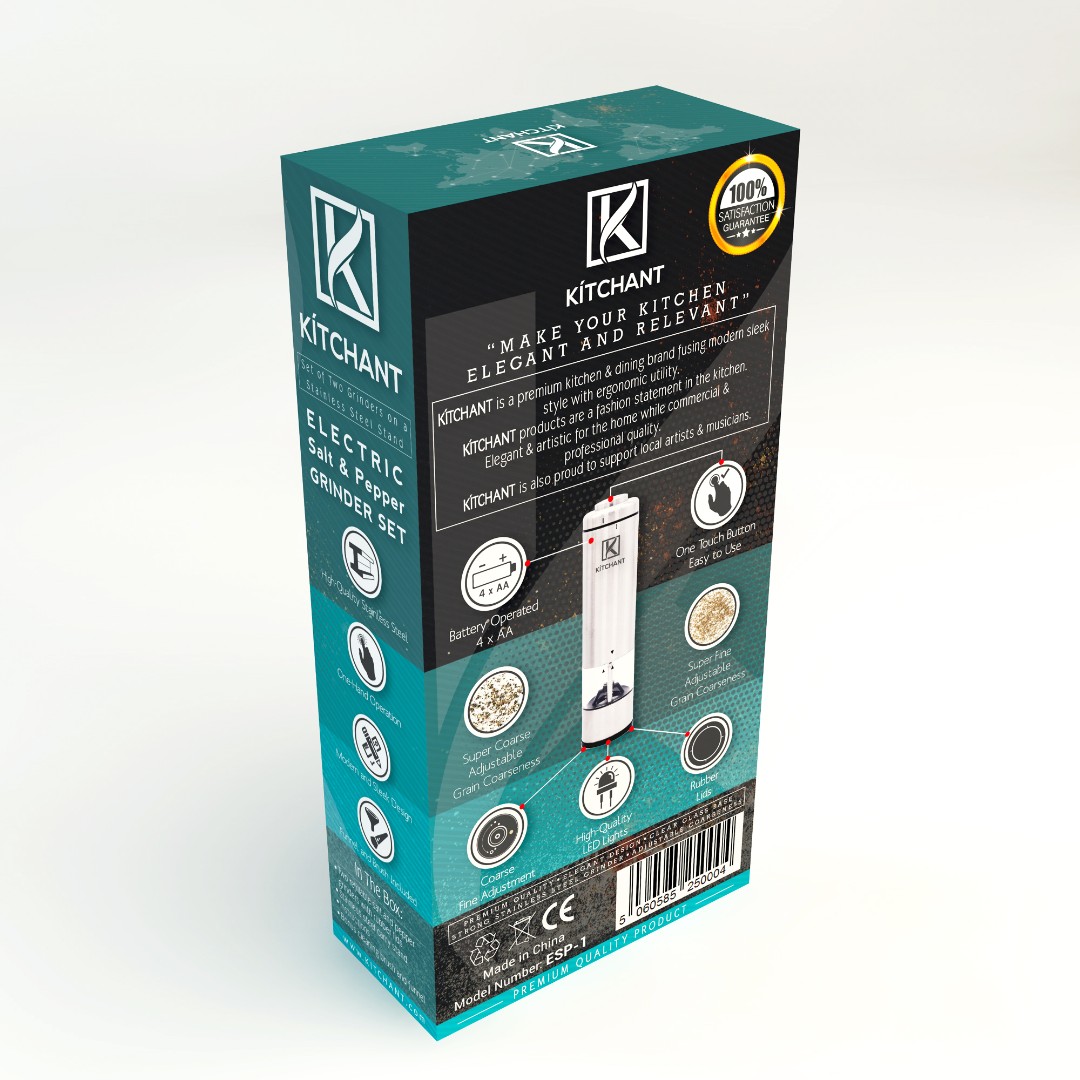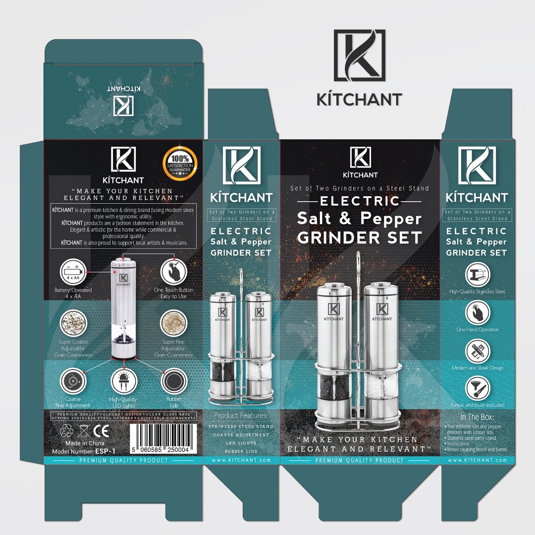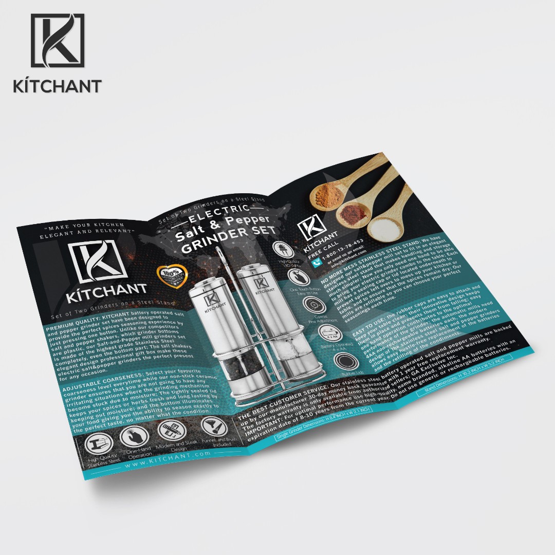 Structured the back panel to include a detailed overview of KÍTCHANT’s brand philosophy, along with clearly illustrated product features such as battery operation, LED lighting, and adjustable coarseness levels.