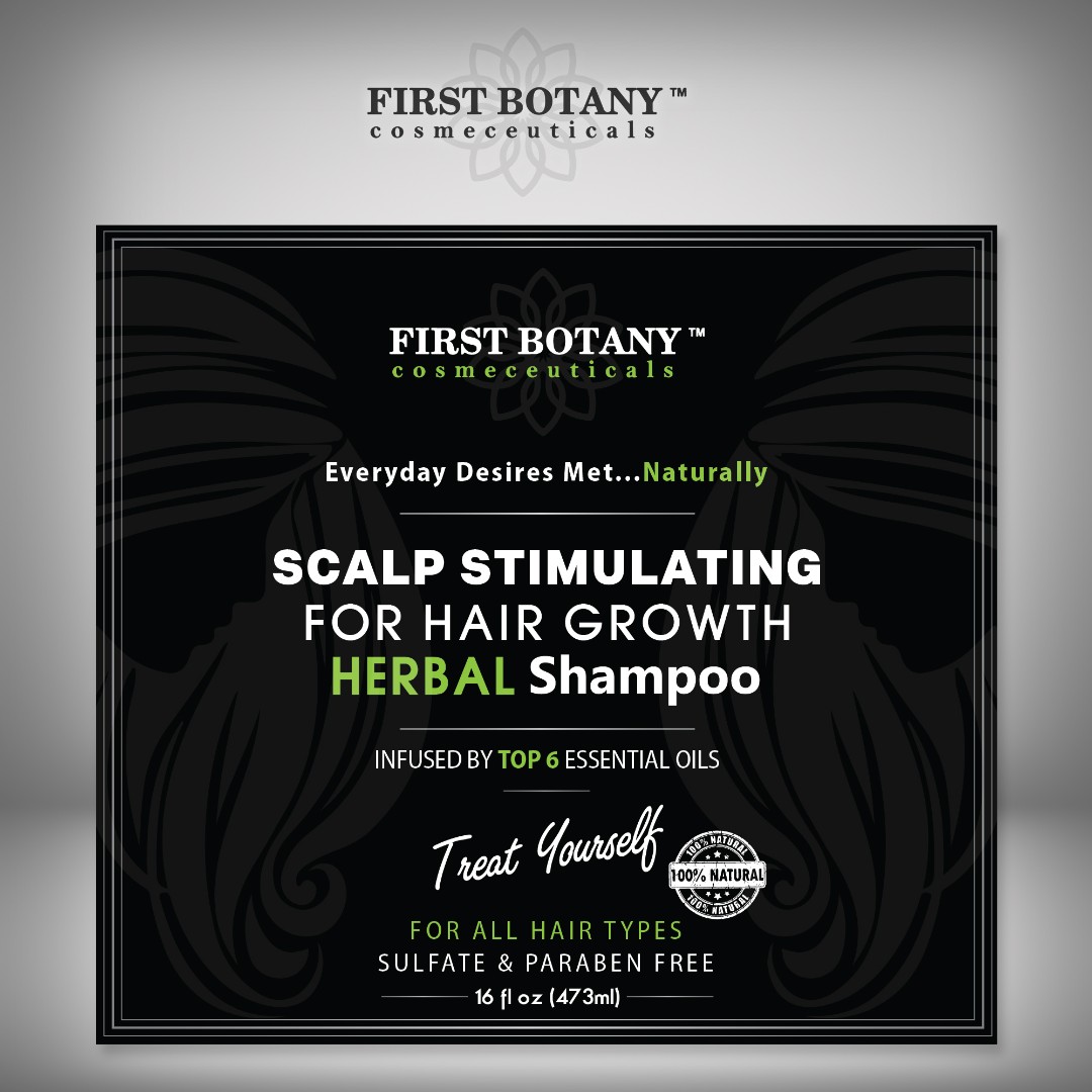 First Botany Cosmeceuticals required a sophisticated and modern label design for their Scalp Stimulating Herbal Shampoo that reflects both premium quality and natural formulation.