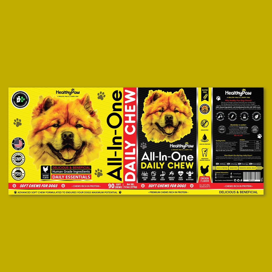 Healthy Paw required an eye-catching and functional packaging design for their All-In-One Daily Chew that clearly communicates multiple health benefits while standing out in the pet supplement market.