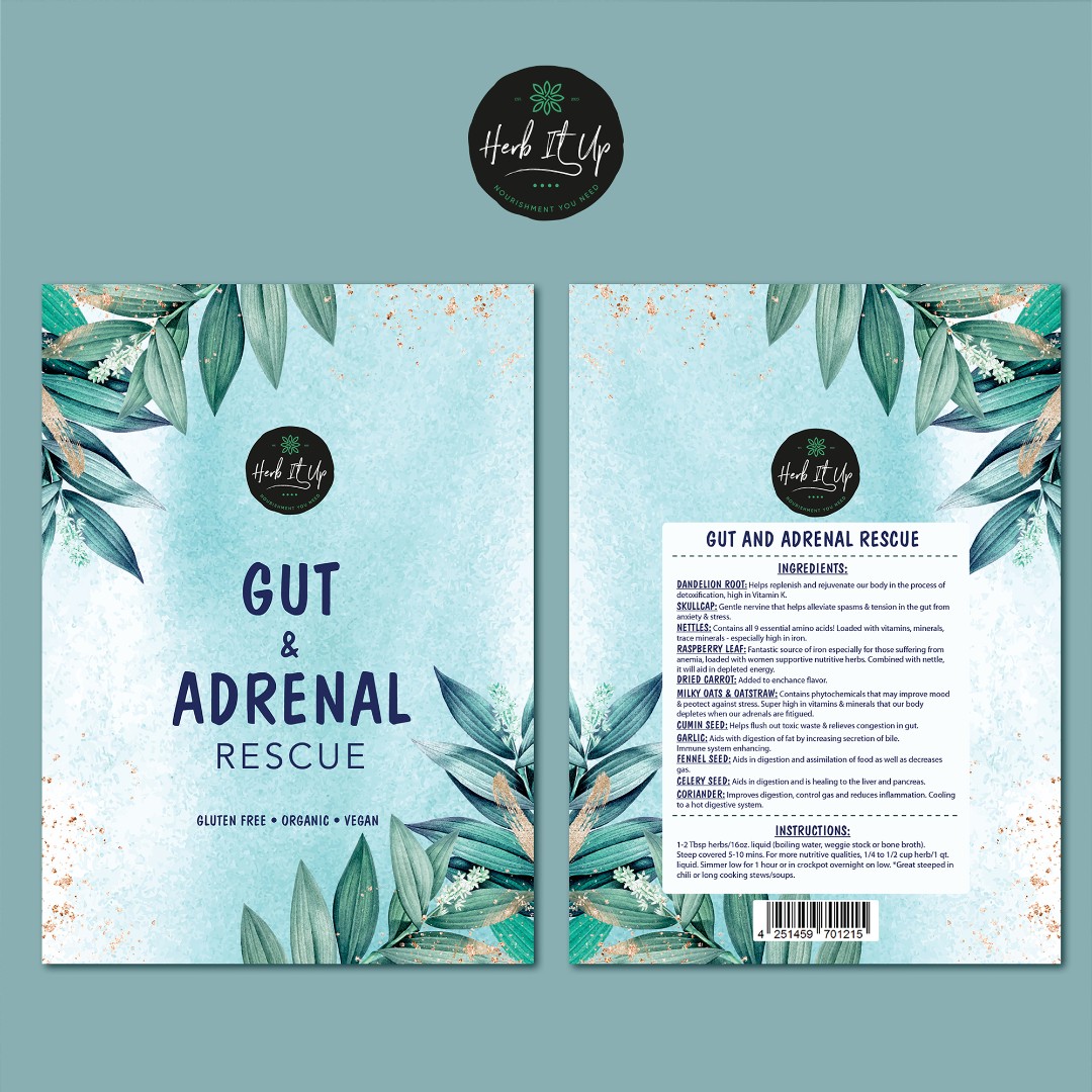 The Gut & Adrenal Rescue herbal product required a complete packaging redesign in order to reflect the brand’s natural and holistic approach within the competitive health and wellness market.