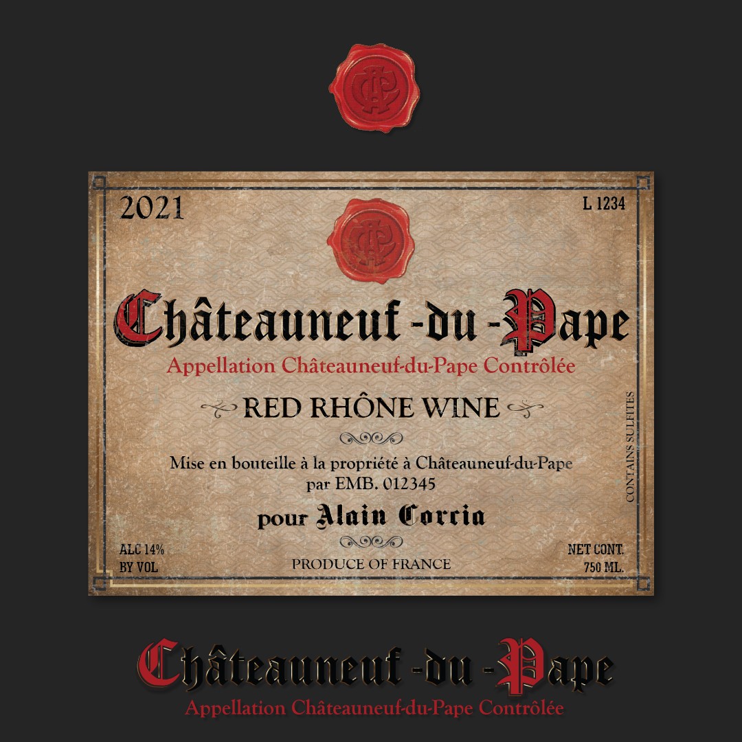 Prestige des Grands Vins de France required a timeless wine label that honors the legacy of Alain Corcia and reflects the heritage of Châteauneuf-du-Pape wines.