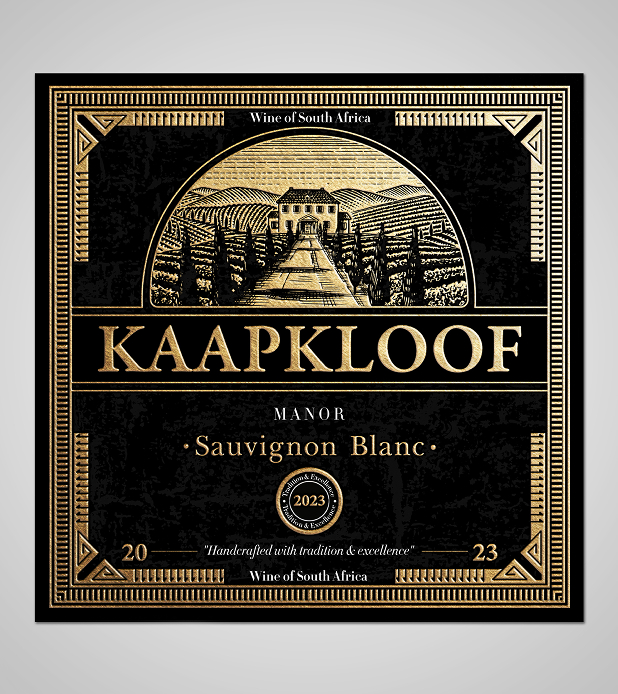 The Kaapkloof Manor label blends heritage and sophistication through engraved illustrations , elegant serif typography , and gold-foil accents . Inspired by Cape Dutch architecture , it conveys tradition and exclusivity , ensuring a timeless, premium appeal that stands out in the luxury wine market .