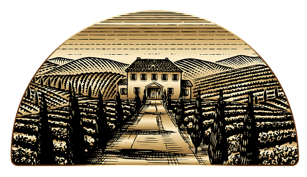 - Engraved illustration of a Cape Dutch estate surrounded by vineyards.