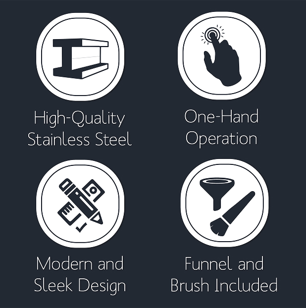 - Clean layout highlighting one-hand operation, LED lights, and adjustable coarseness.