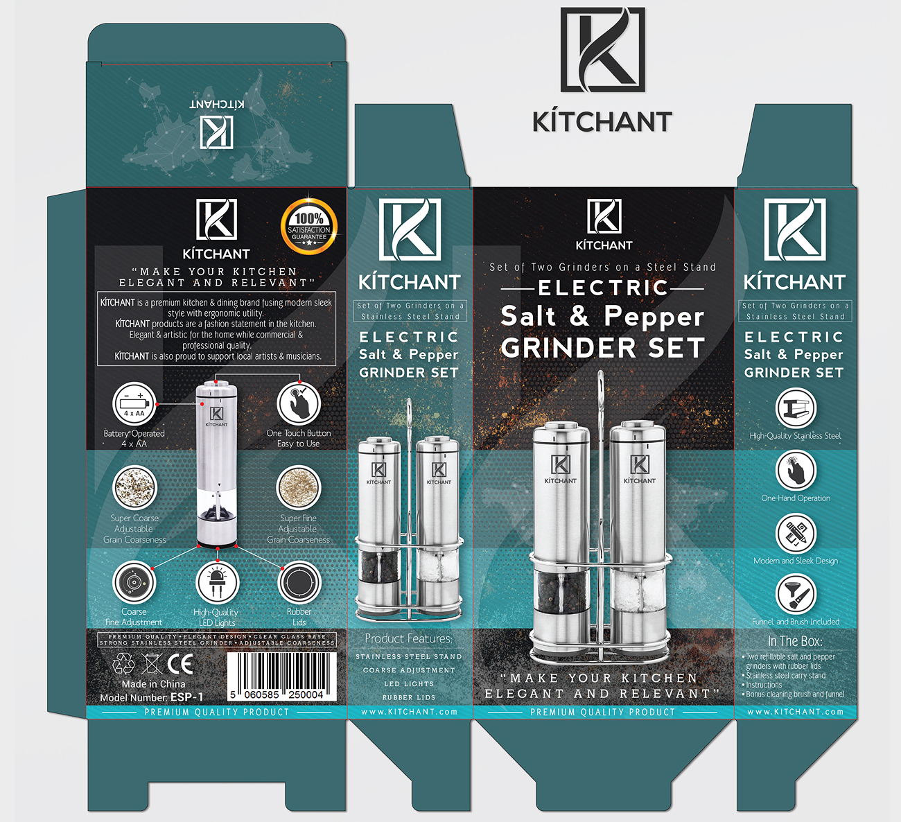 KÍTCHANT is a premium kitchenware brand looking to establish a powerful presence on platforms like Amazon while aligning with the expectations of high-end kitchen and dining aesthetics. Their Electric Salt & Pepper Grinder Set needed a compelling design language that could clearly communicate quality, sophistication, and usability.