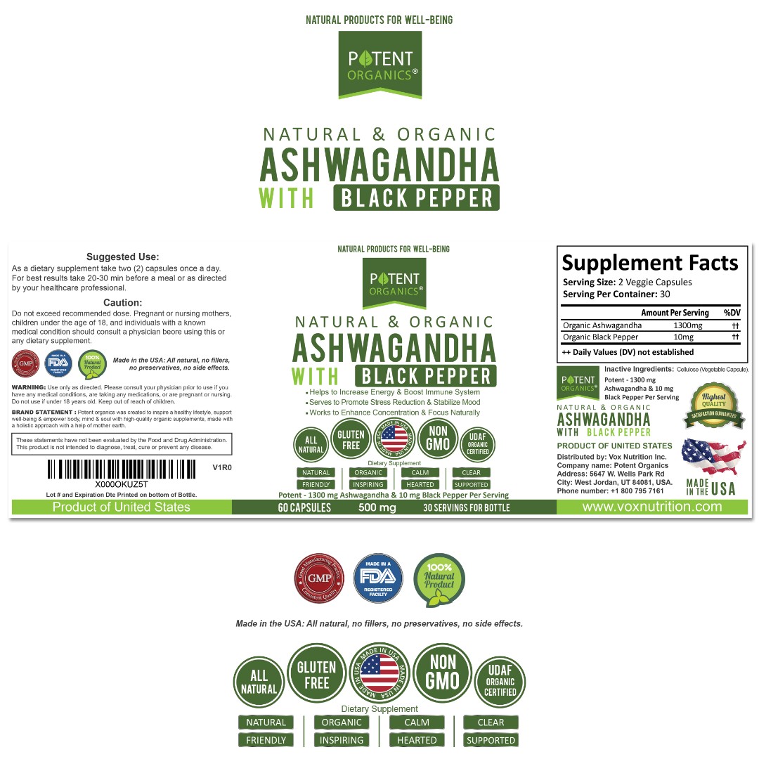 As a premium organic supplement brand, Potent Organics needed a label for their Ashwagandha with Black Pepper product that reflects both natural purity and professional credibility.