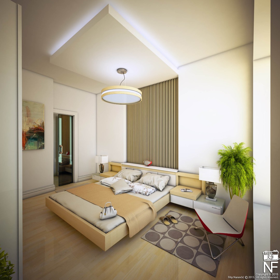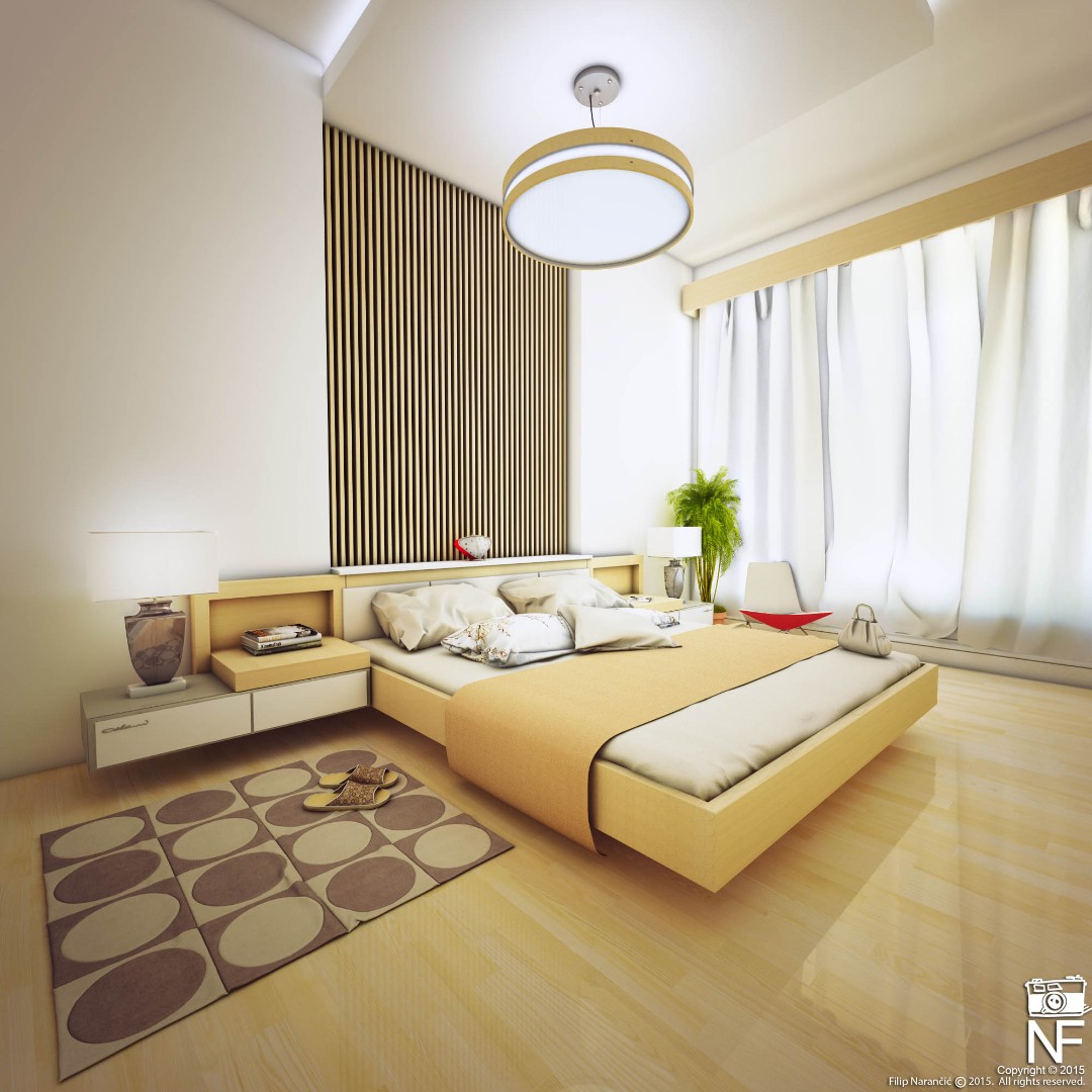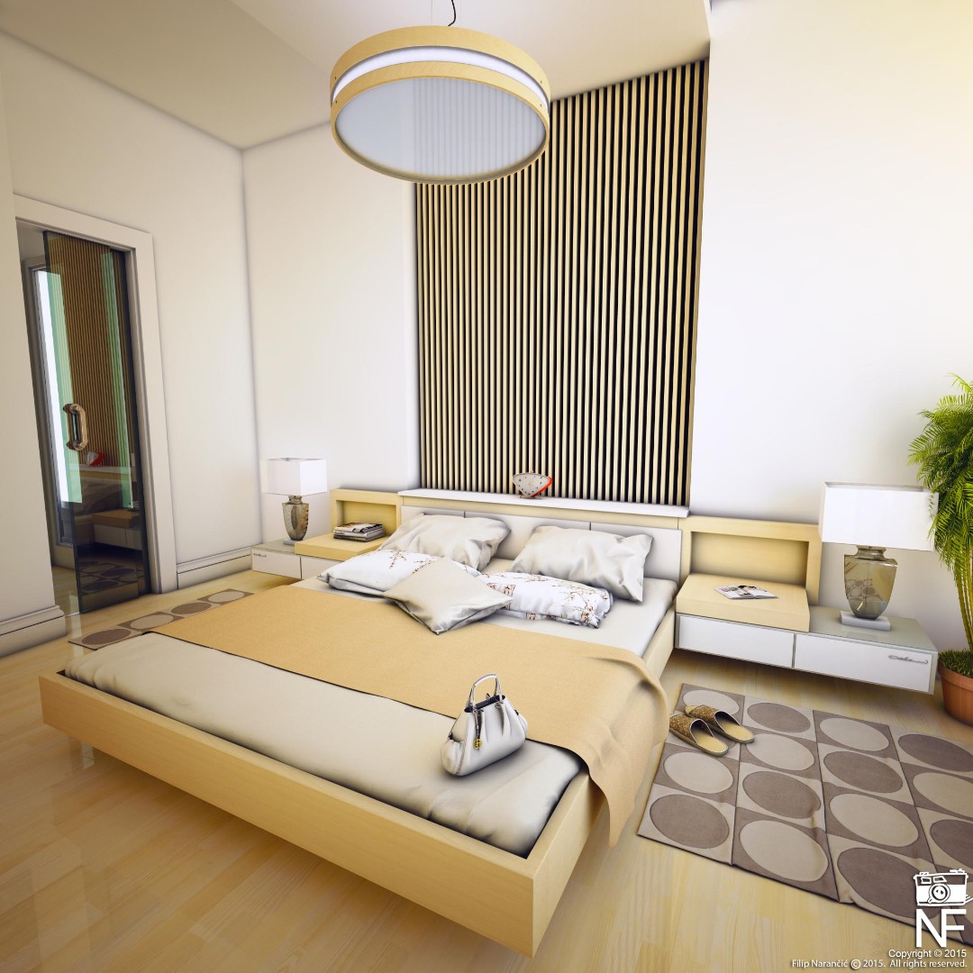 Created a master bedroom with clean lines and wood-textured wall panels behind the bed