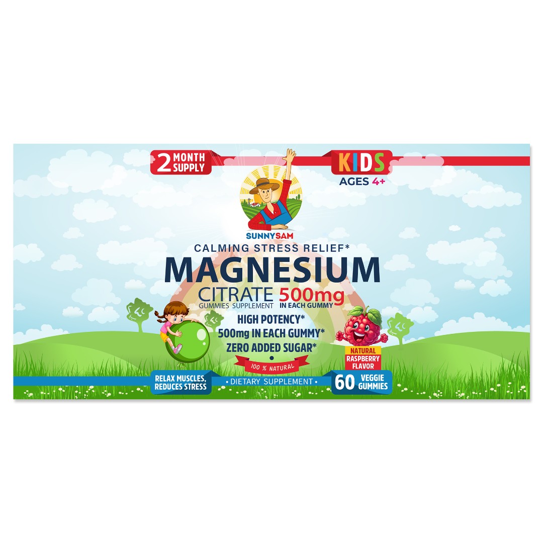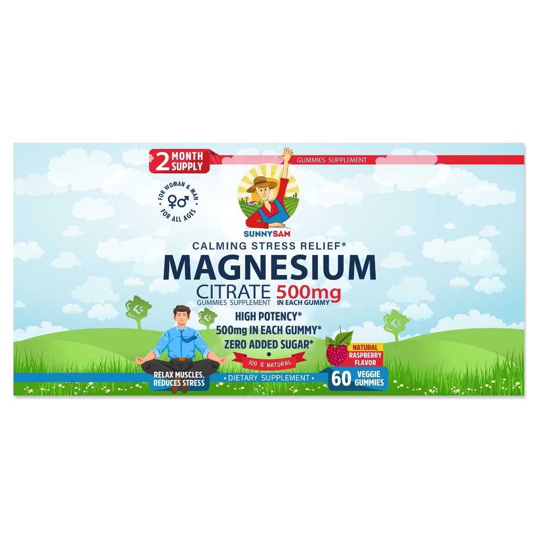Sunny Sam required an eye-catching label for Magnesium Citrate Gummies that serves as the primary visual across Amazon, Walmart, and their official website.