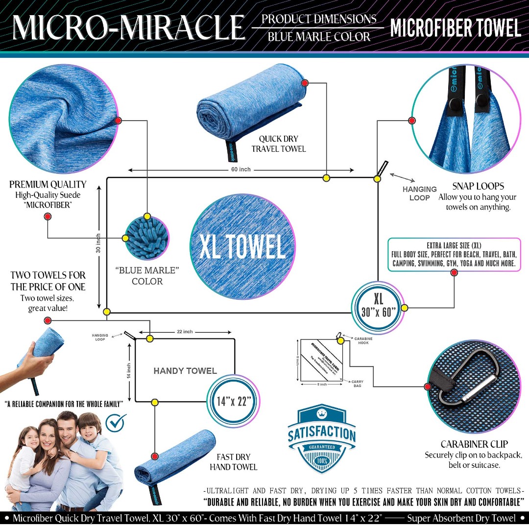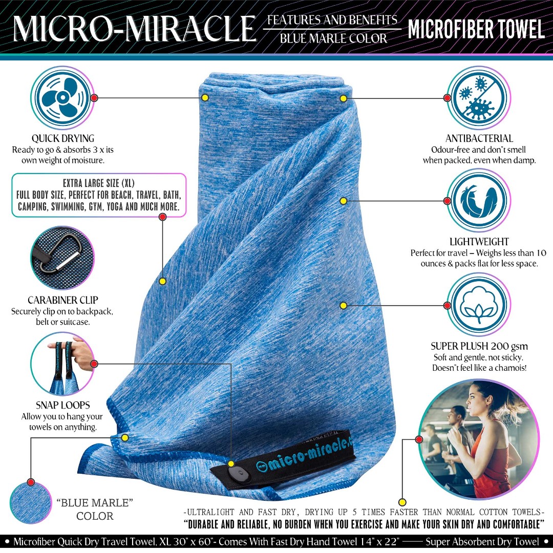 Highlighted key product features such as super absorbent material, quick-drying performance, lightweight and space-saving design, antibacterial properties, premium suede microfiber fabric, versatile multi-use functionality, and easy attachment with carabiner clip and snap loops