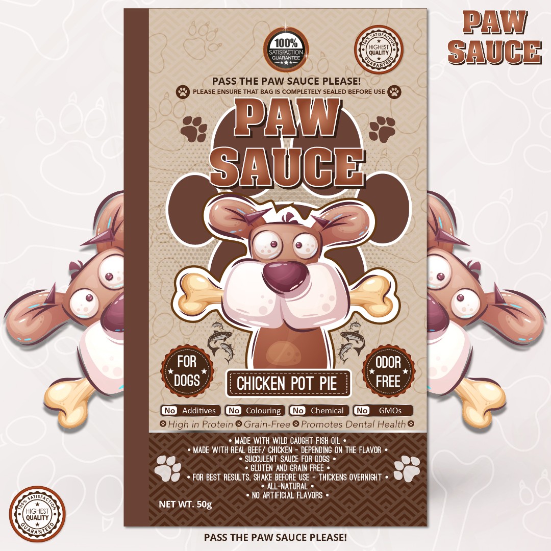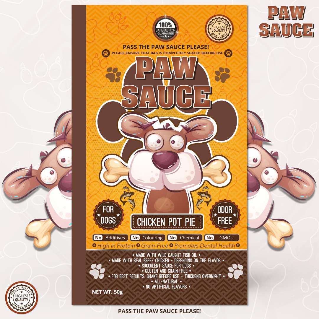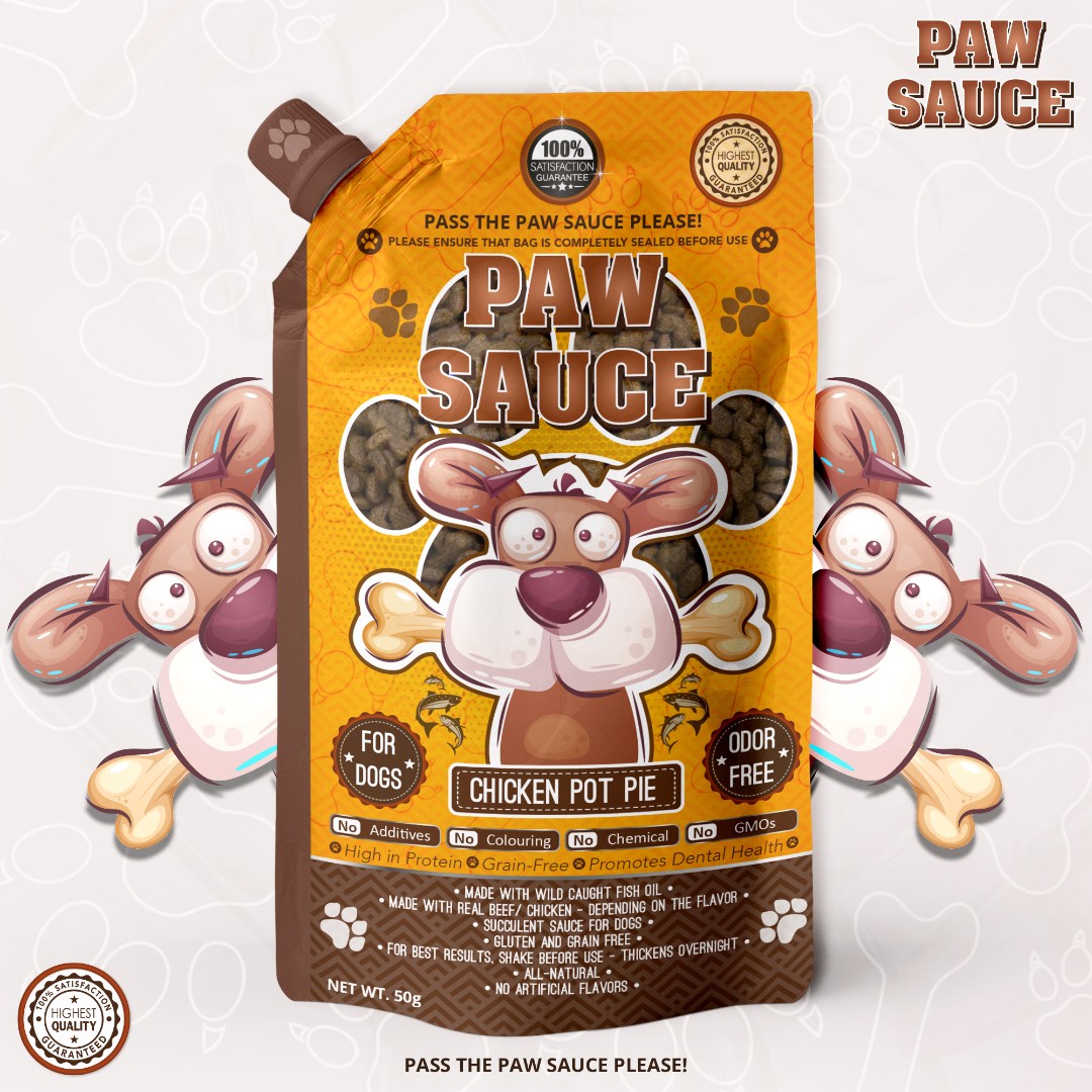 Paw Sauce required a vibrant and eye-catching spout pouch design for their new pet food sauce line that communicates natural benefits while maintaining a fun brand personality.