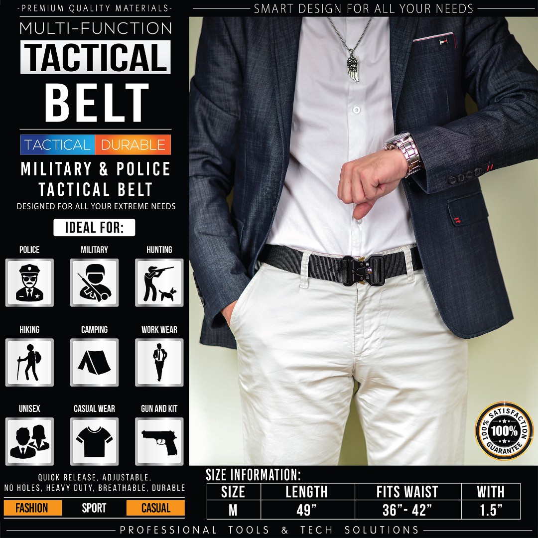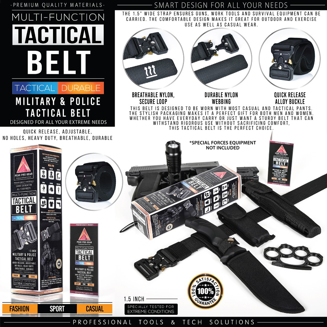 Highlighted key product features such as military-grade breathable nylon strap, quick-release alloy buckle with dual-tab locking system, adjustable no-hole design, heavy-duty load-bearing capability, versatile tactical use, and fully adjustable one-size-fits-all fit