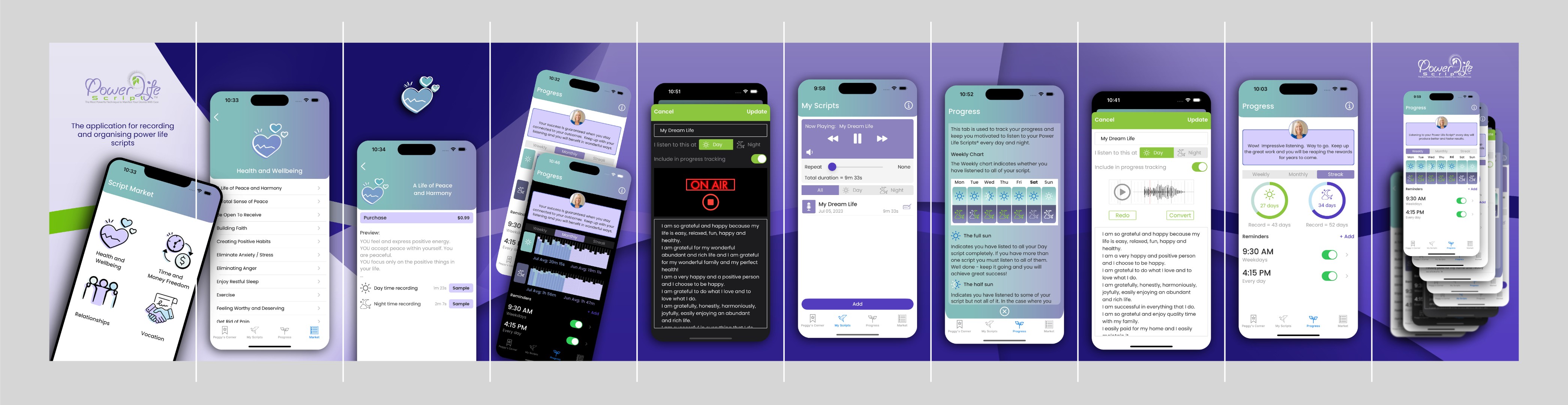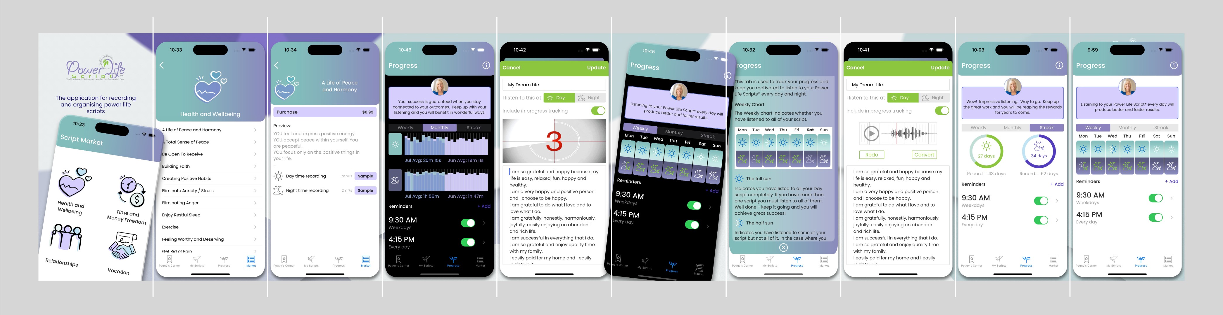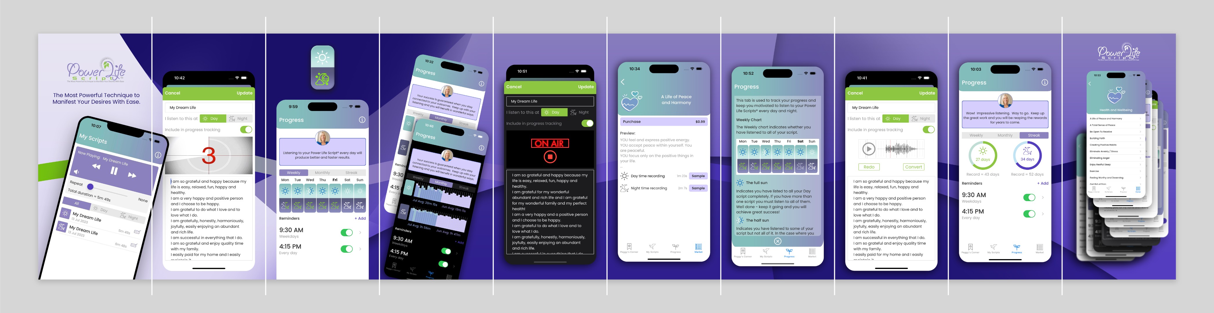 Full mobile UI design (8+ screens) – intuitive navigation, progress tracking, and affirmation library flows.