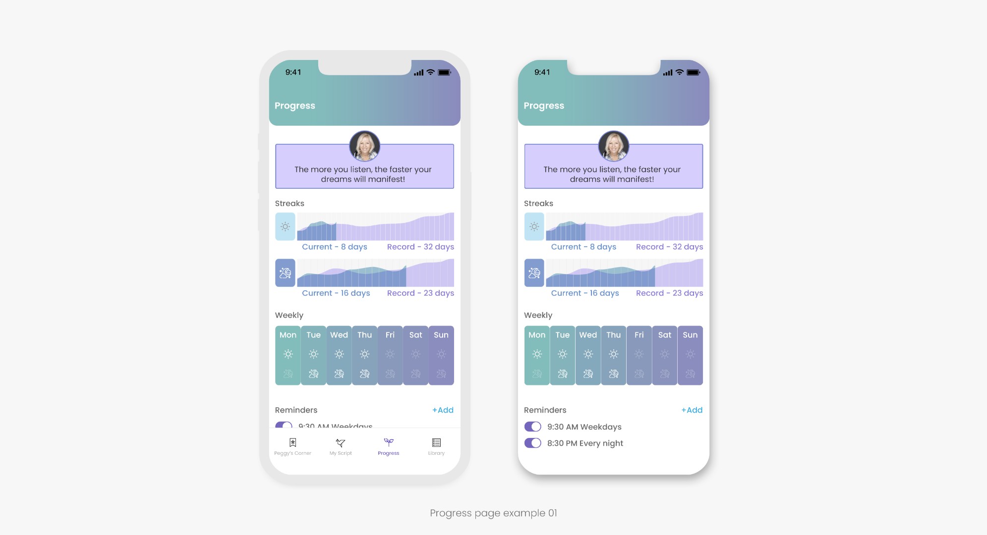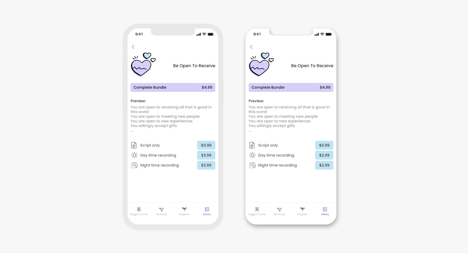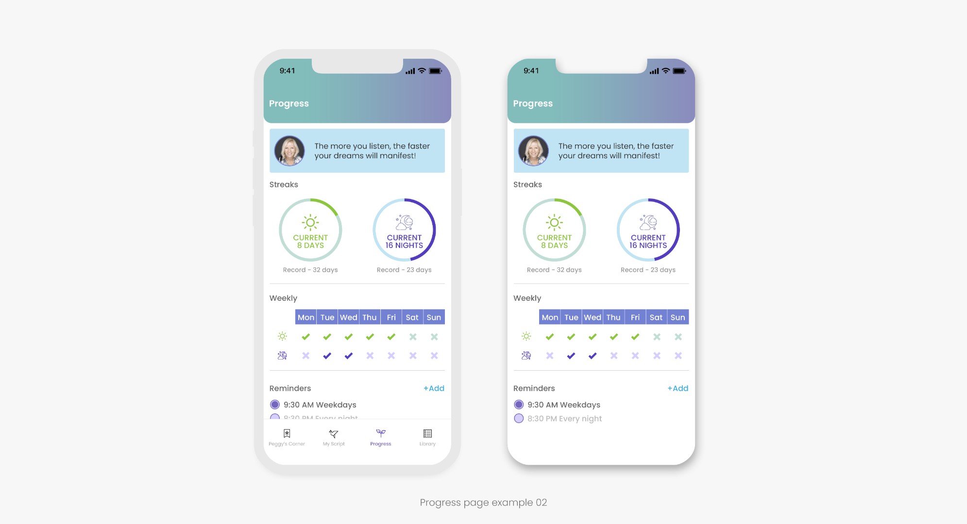 Full mobile UI design (8+ screens) – intuitive navigation, progress tracking, and affirmation library flows.