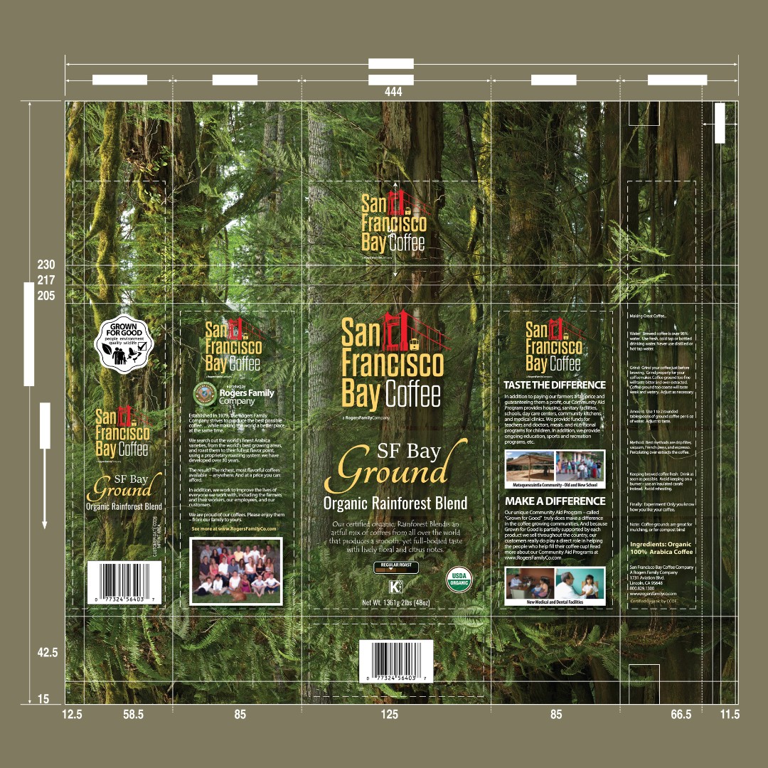The SF Bay Ground Organic Rainforest Blend required a packaging design that emphasizes the product’s organic and eco-friendly attributes while maintaining the brand’s established identity.