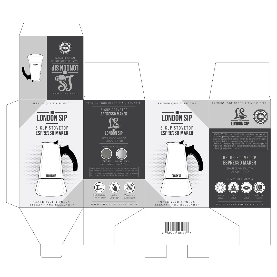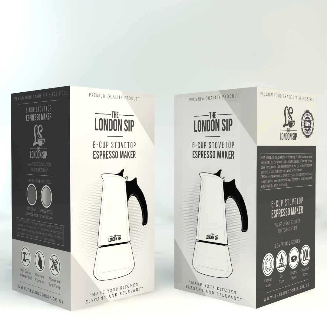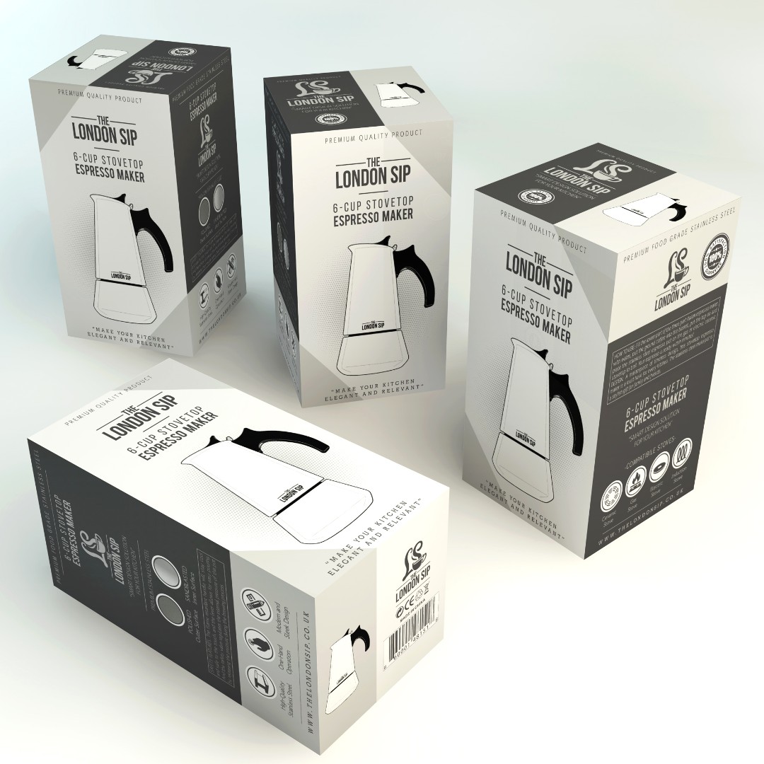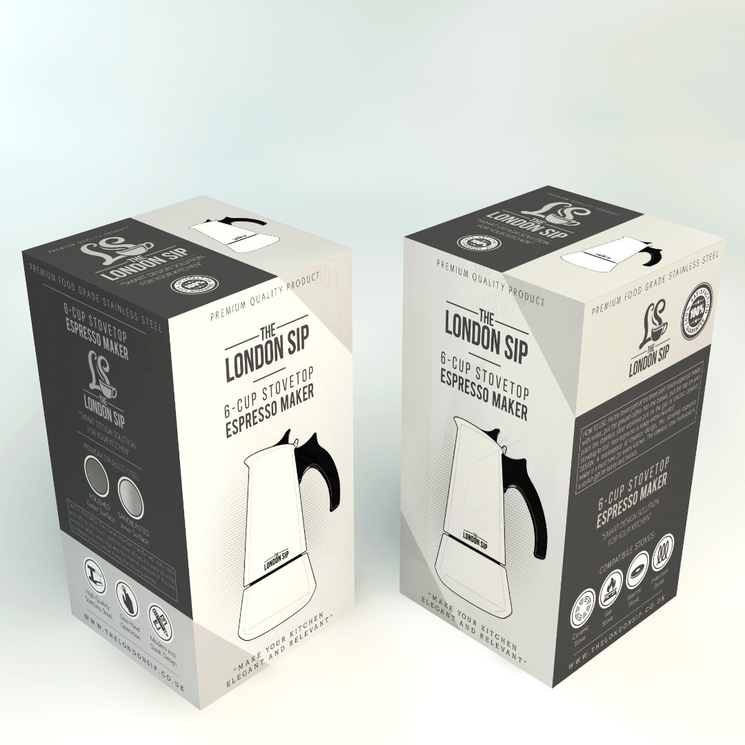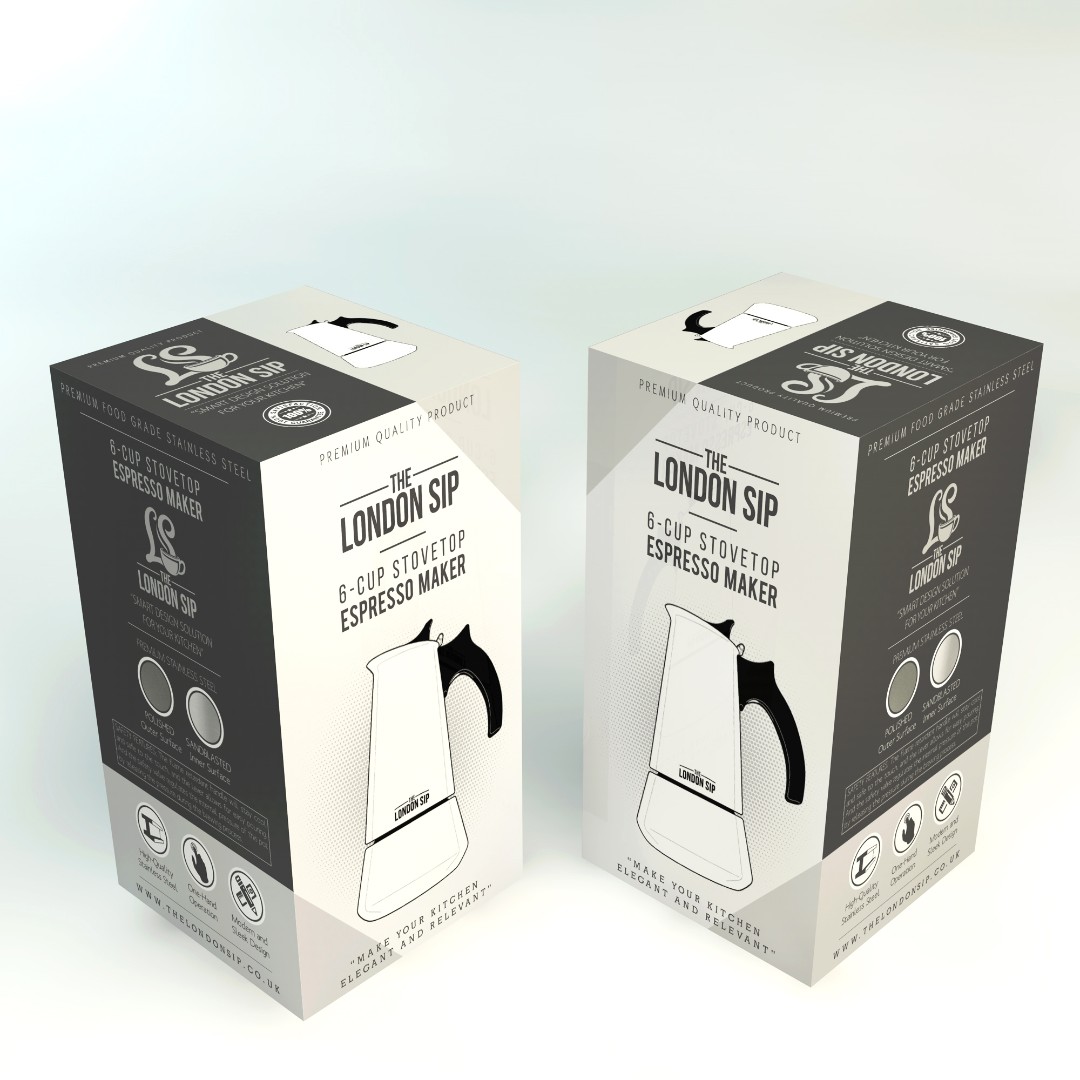The London Sip – Stovetop Espresso Maker required a packaging redesign that preserves the traditional identity of the classic moka pot while introducing a modern visual language.