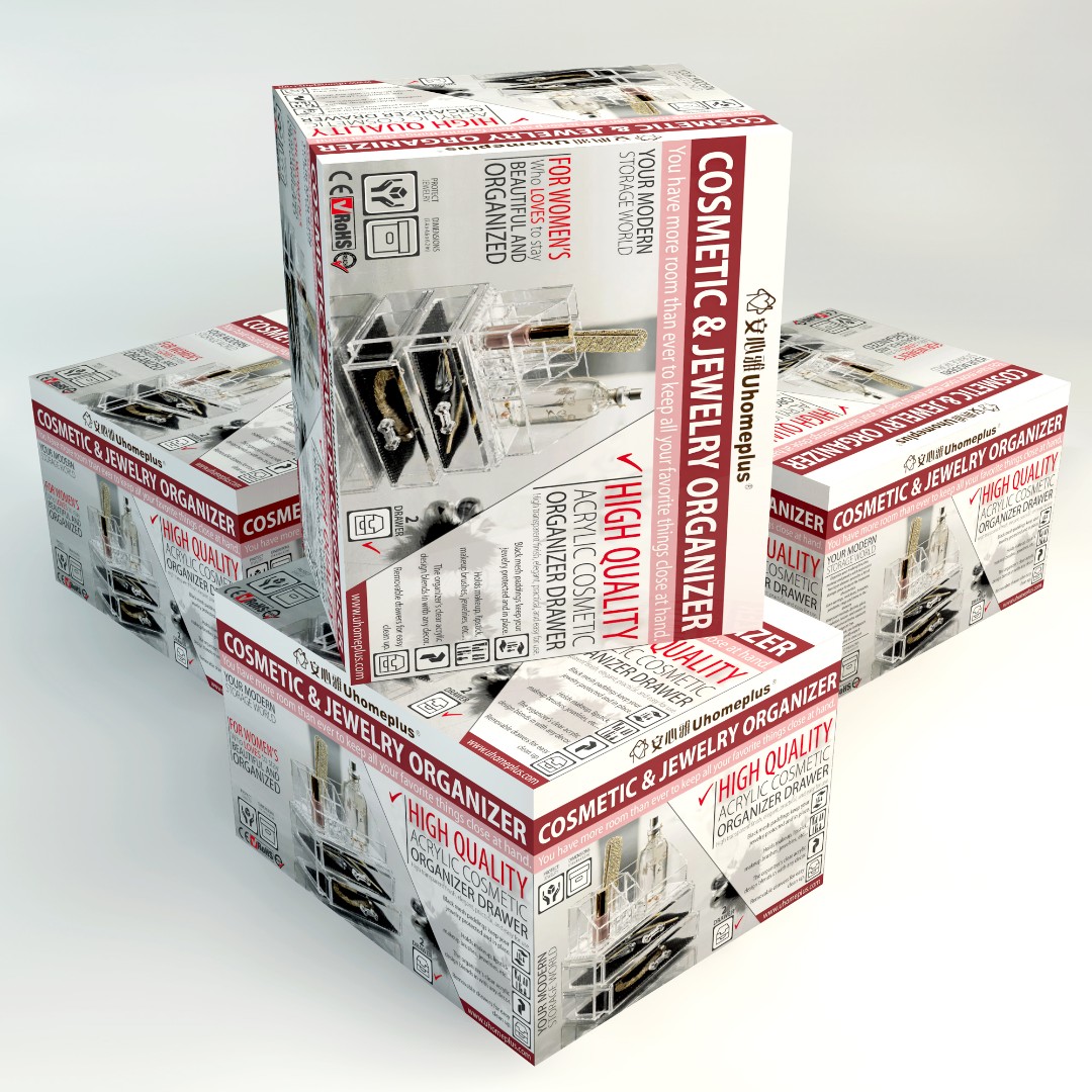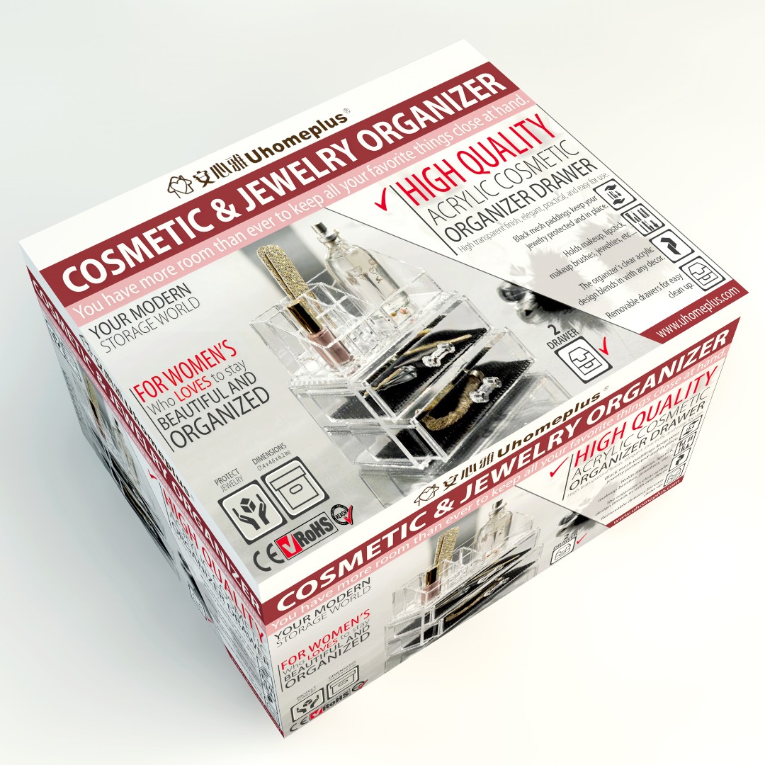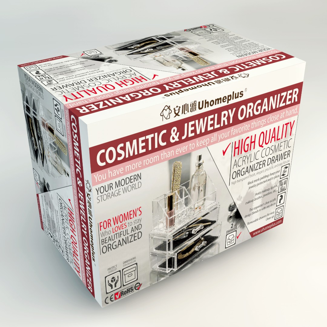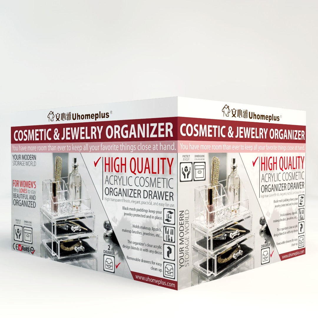 UHomePlus required a functional and visually appealing packaging design for their Cosmetic & Jewelry Organizer that clearly communicates versatility while maintaining a modern and elegant aesthetic.