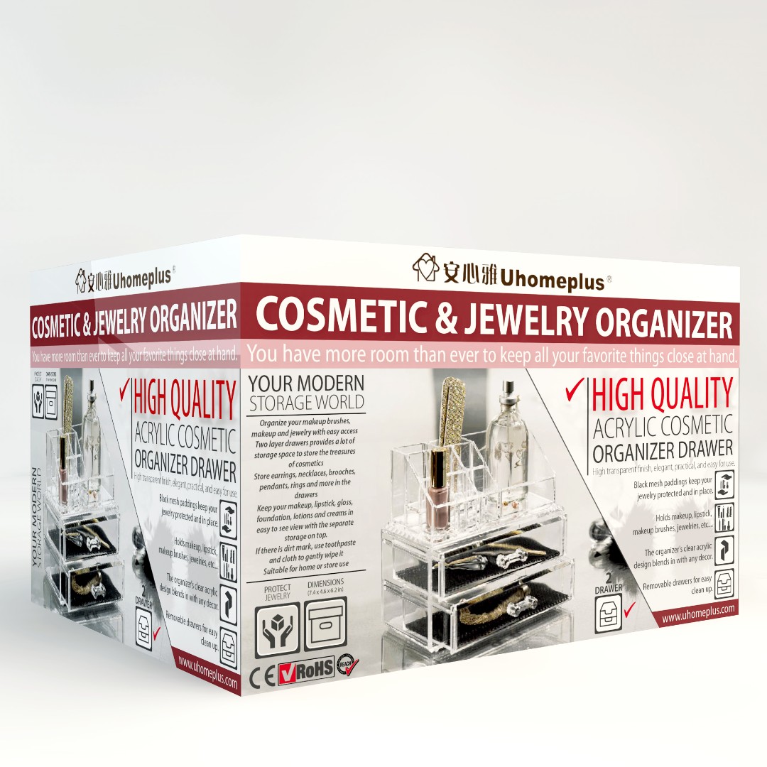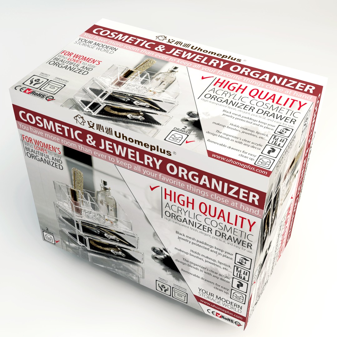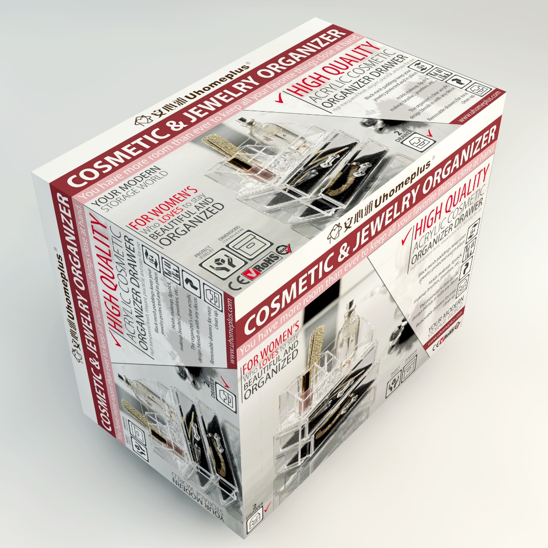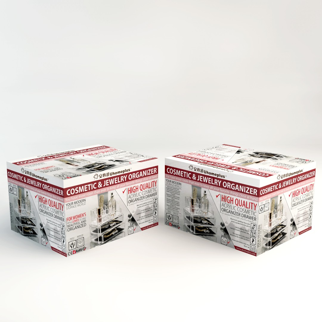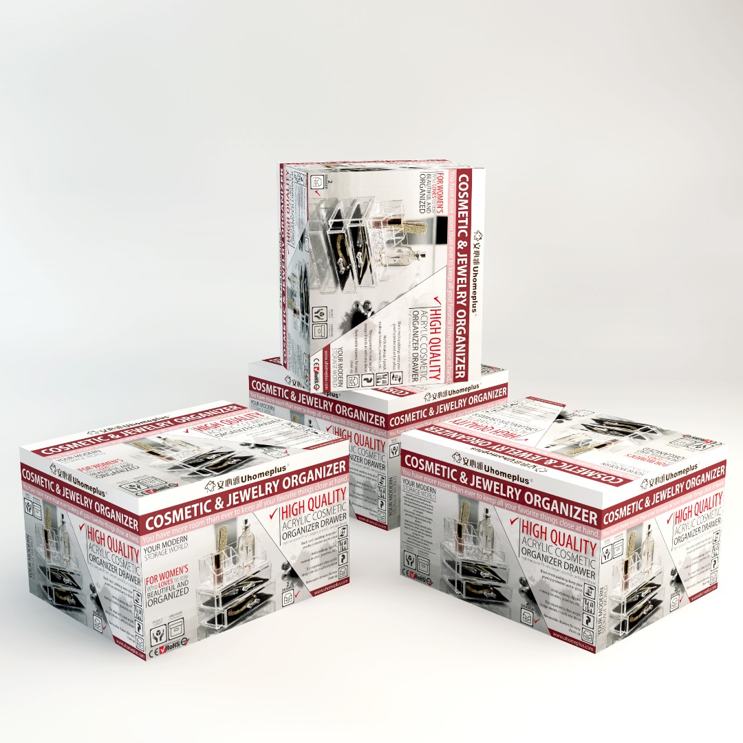 UHomePlus required a functional and visually appealing packaging design for their Cosmetic & Jewelry Organizer that clearly communicates versatility while maintaining a modern and elegant aesthetic.