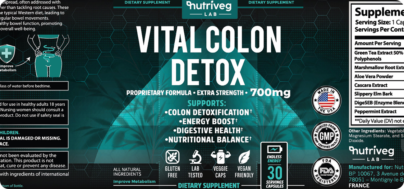 Vital Colon Detox supports healthy bowel function, promotes regular toxin and waste elimination, and contributes to overall well-being and balance of the digestive system.
