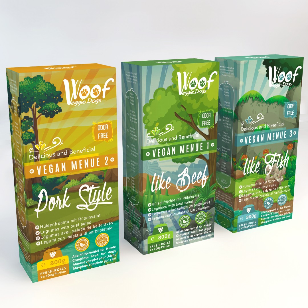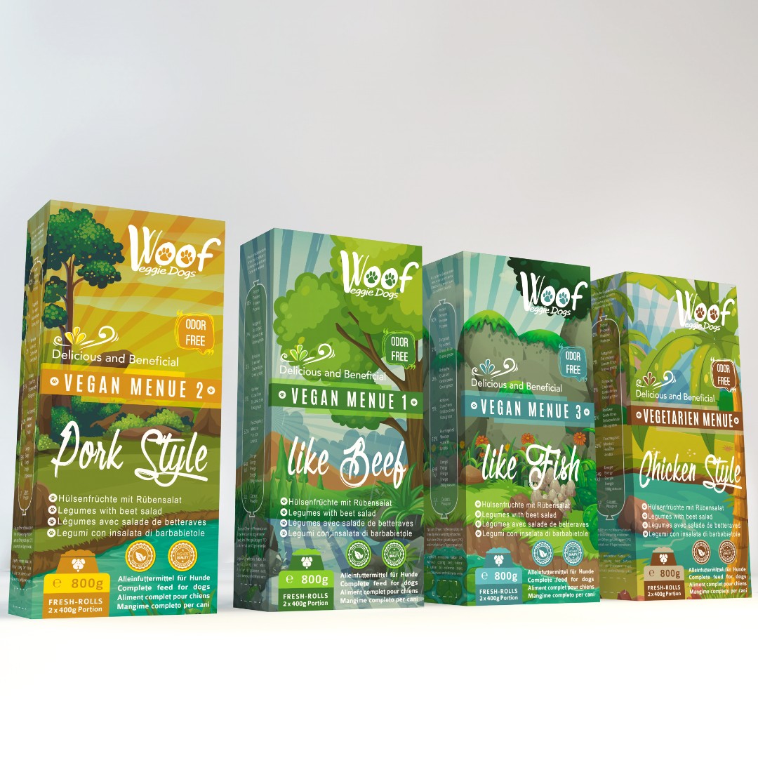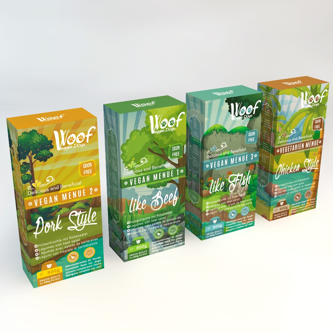 voof e.K. required a distinct and eco-friendly packaging design for their Woof Veggie Dogs vegan dog food line that clearly differentiates four product variations while maintaining brand consistency.