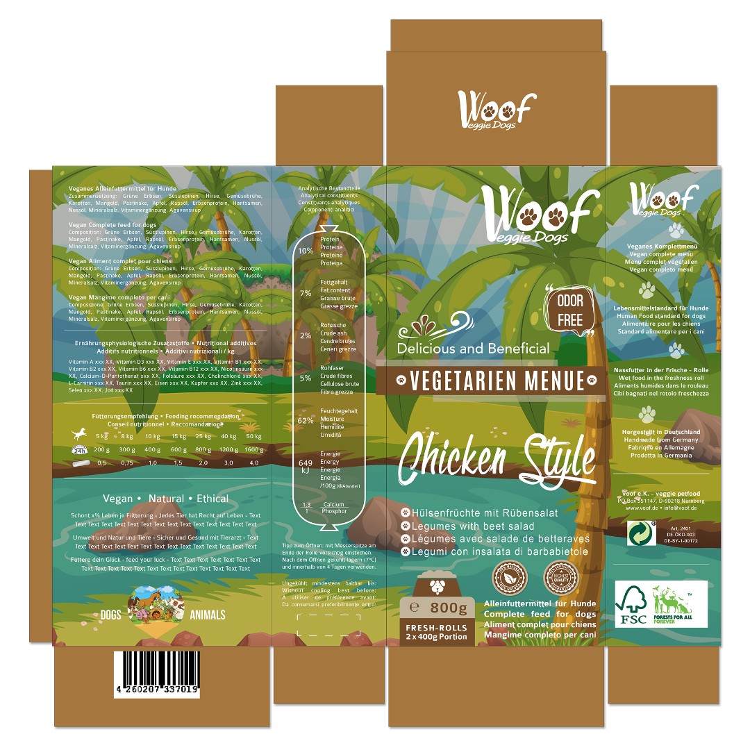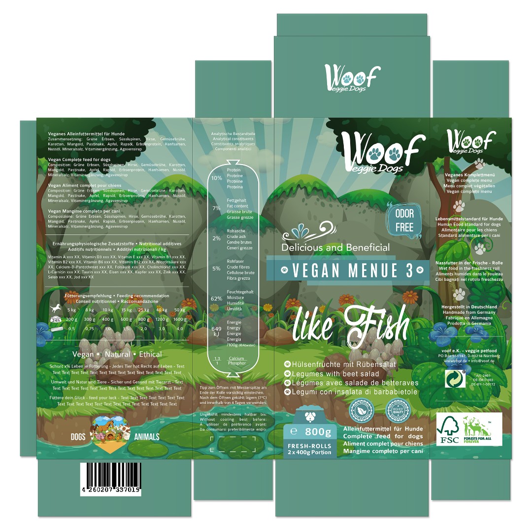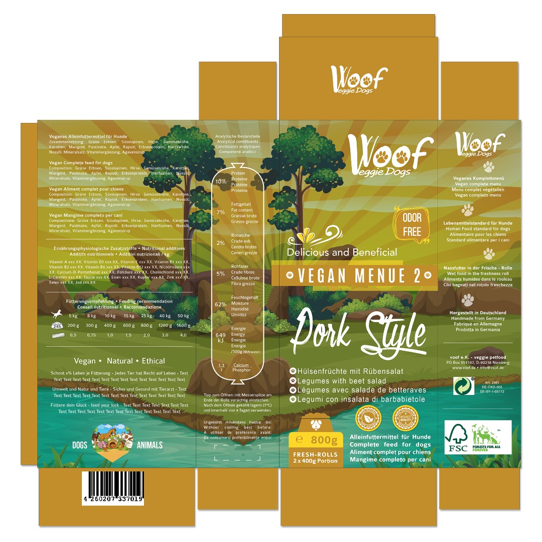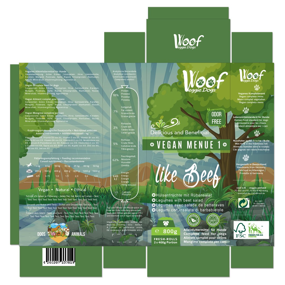 voof e.K. required a distinct and eco-friendly packaging design for their Woof Veggie Dogs vegan dog food line that clearly differentiates four product variations while maintaining brand consistency.